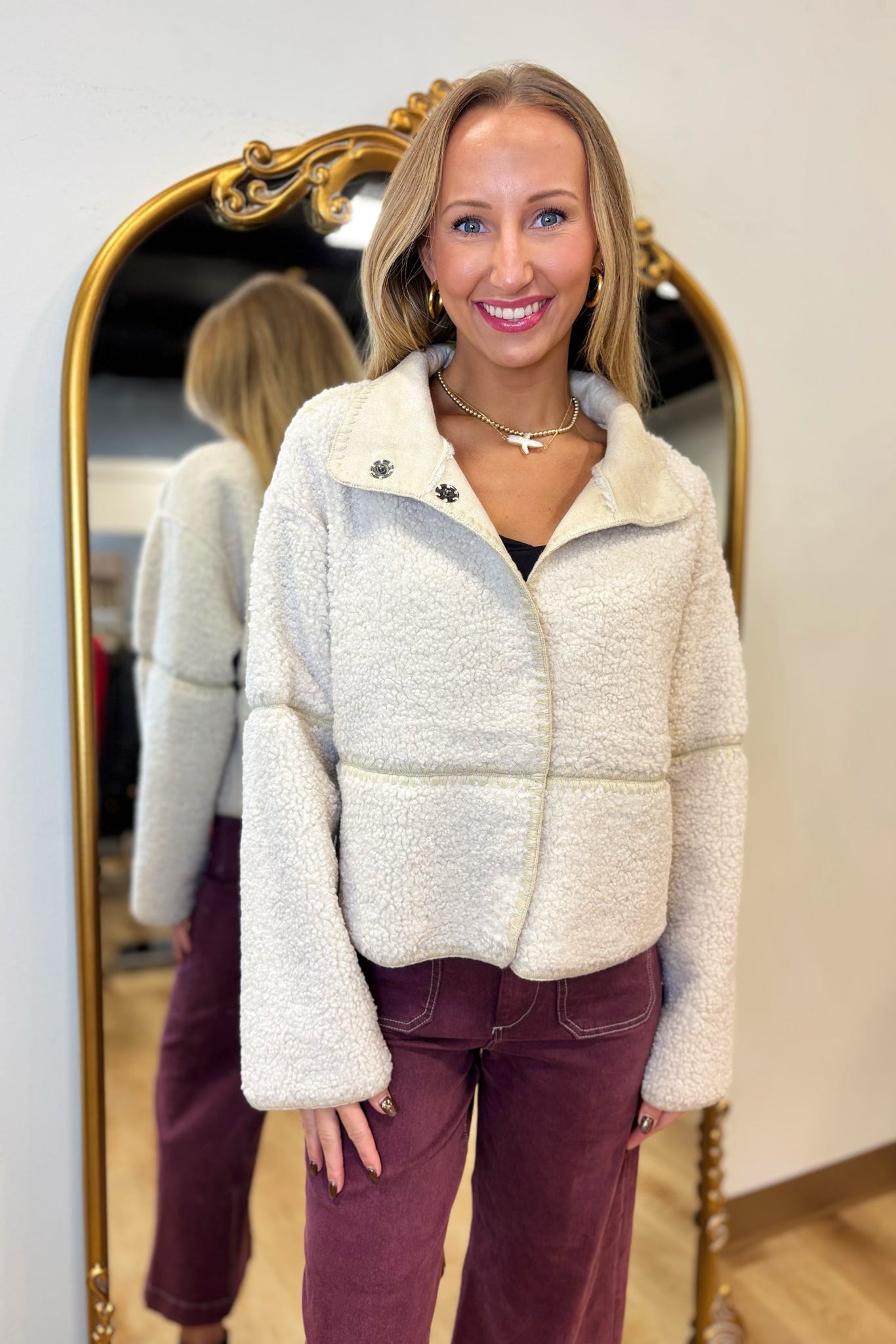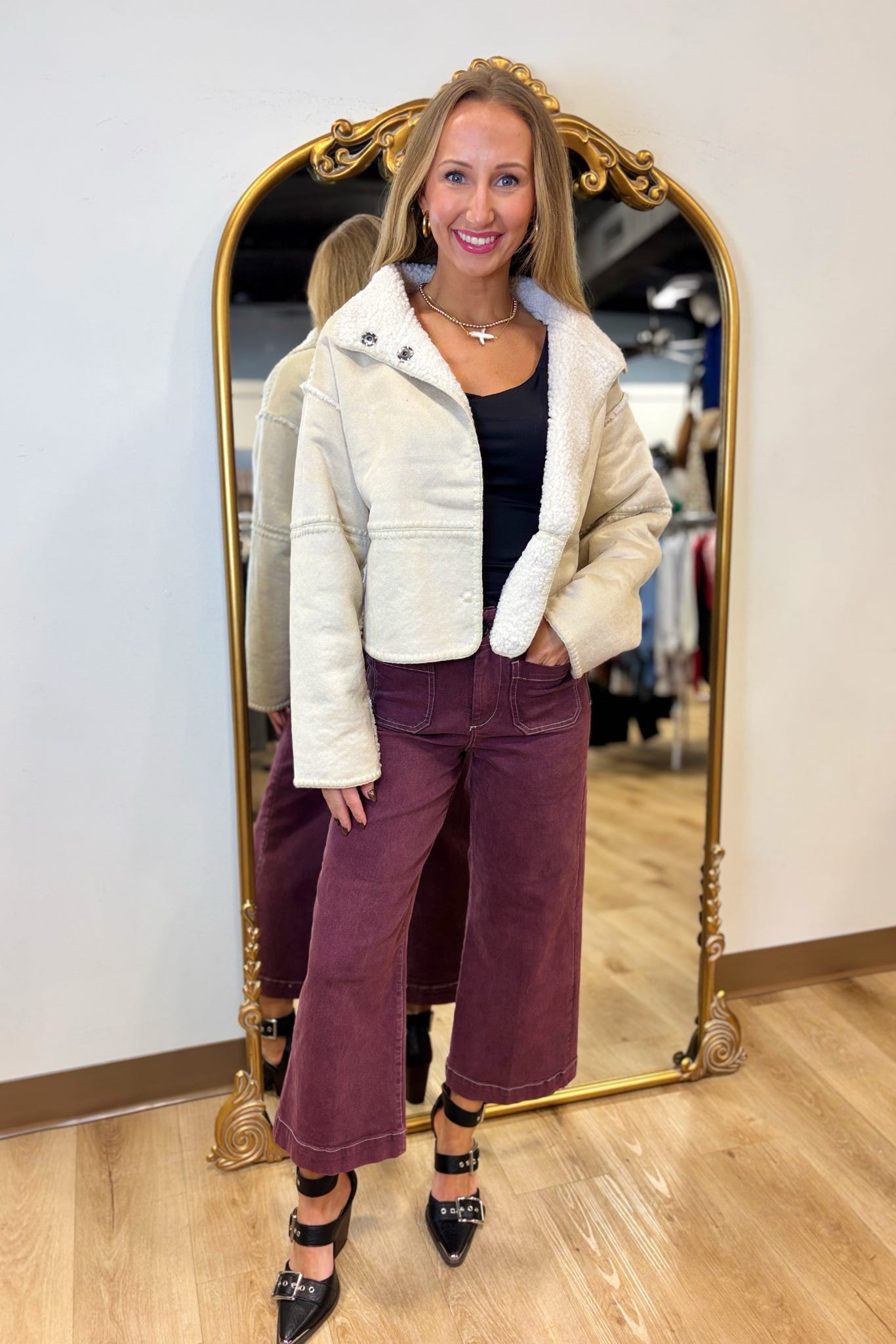 Luxe suede & sherpa, reversible w/ stitching detail.