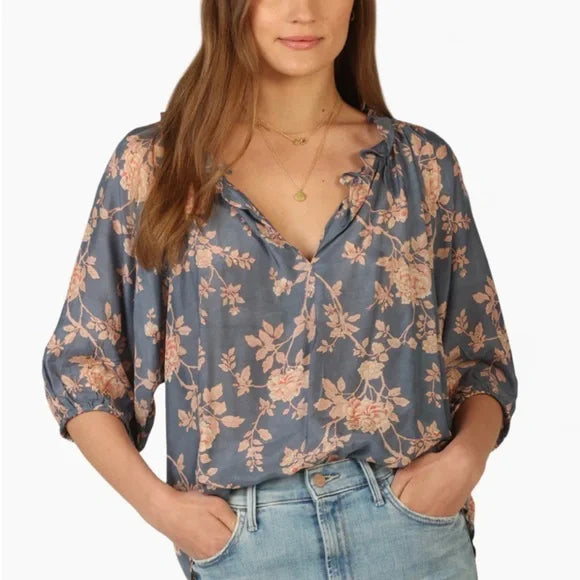 Dylan Kaia Collared Blouse Denim Floral 100% Cotton.