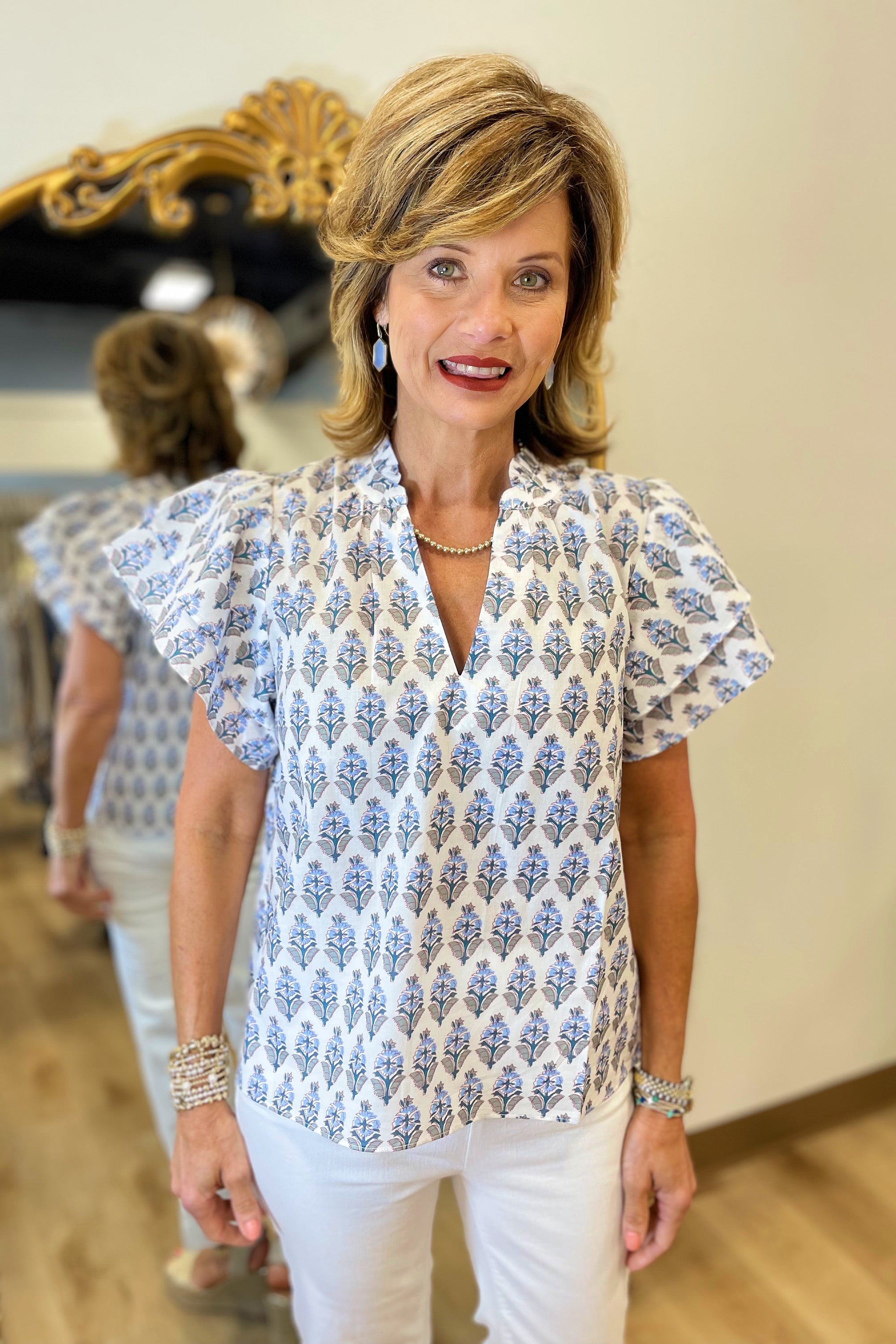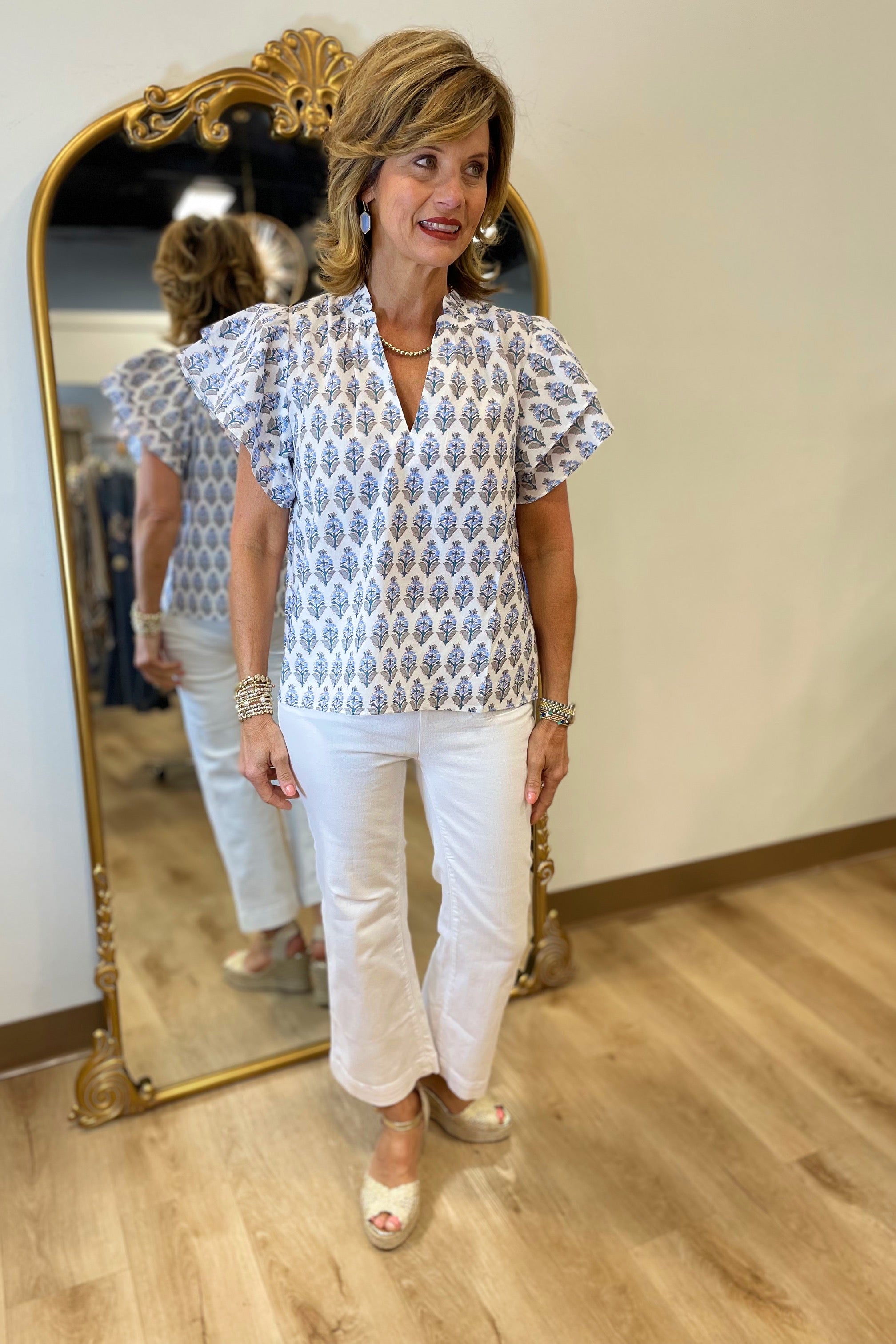 Elevate your spring wardrobe with the Dylan Mira Top. Its fun whimsical print and feminine flutter sleeves make it perfect for any occasion. Whether you pair it with jeans or a skirt, this top will add a touch of playfulness and style to your outfit.