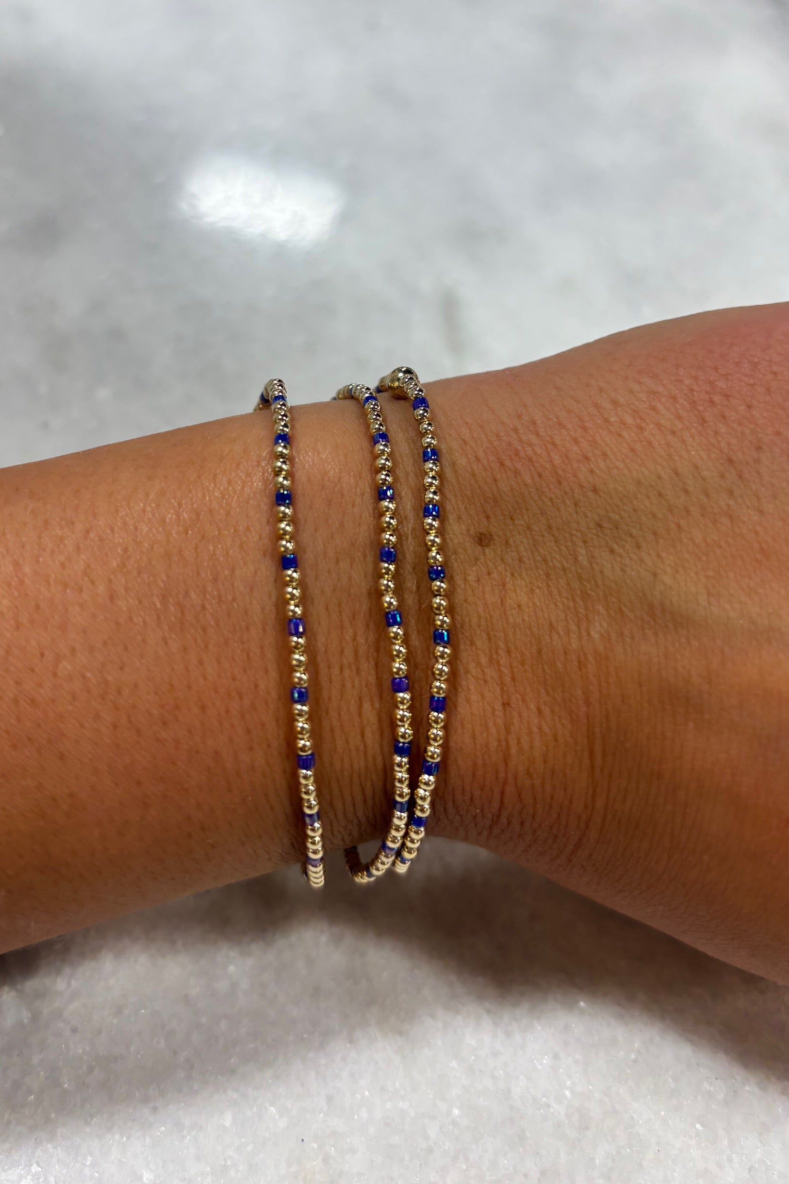 Hand beaded on high performance elastic for a slight stretch to easily roll on and off your wrist