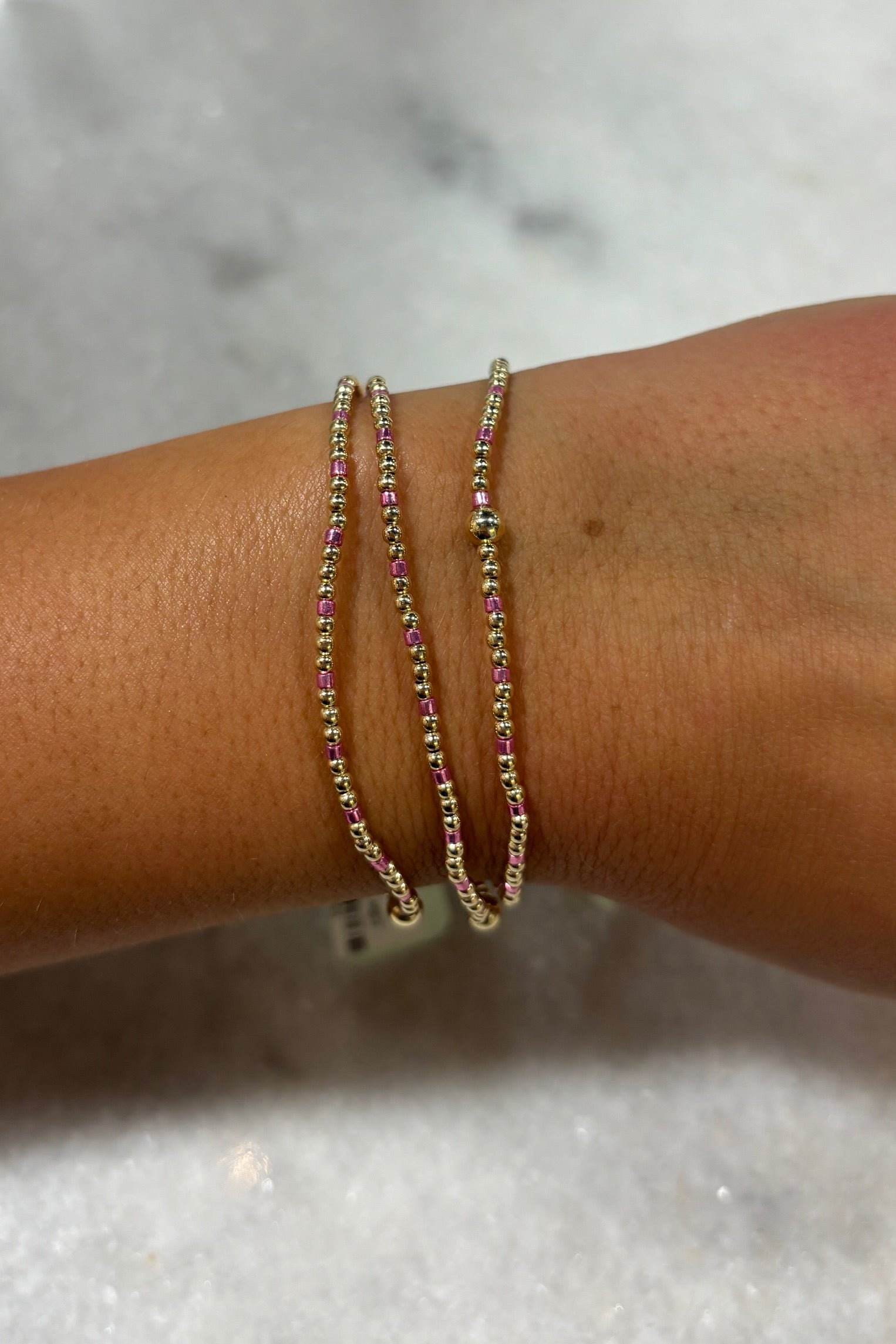 Hand beaded on high performance elastic for a slight stretch to easily roll on and off your wrist