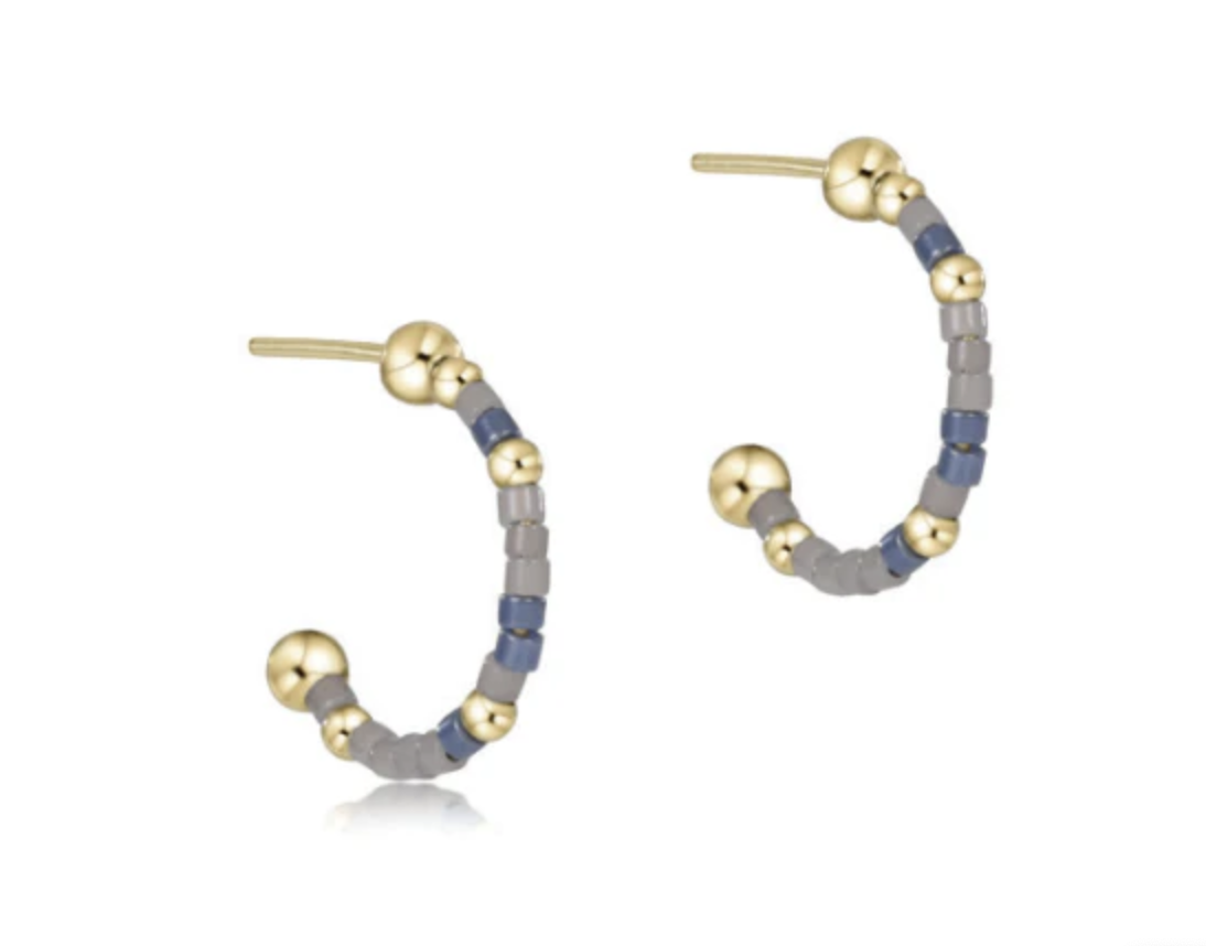 Made with various colors of randomly mixed 2mm seed beads and 2mm 14k gold-filled beads on a 1" post hoop