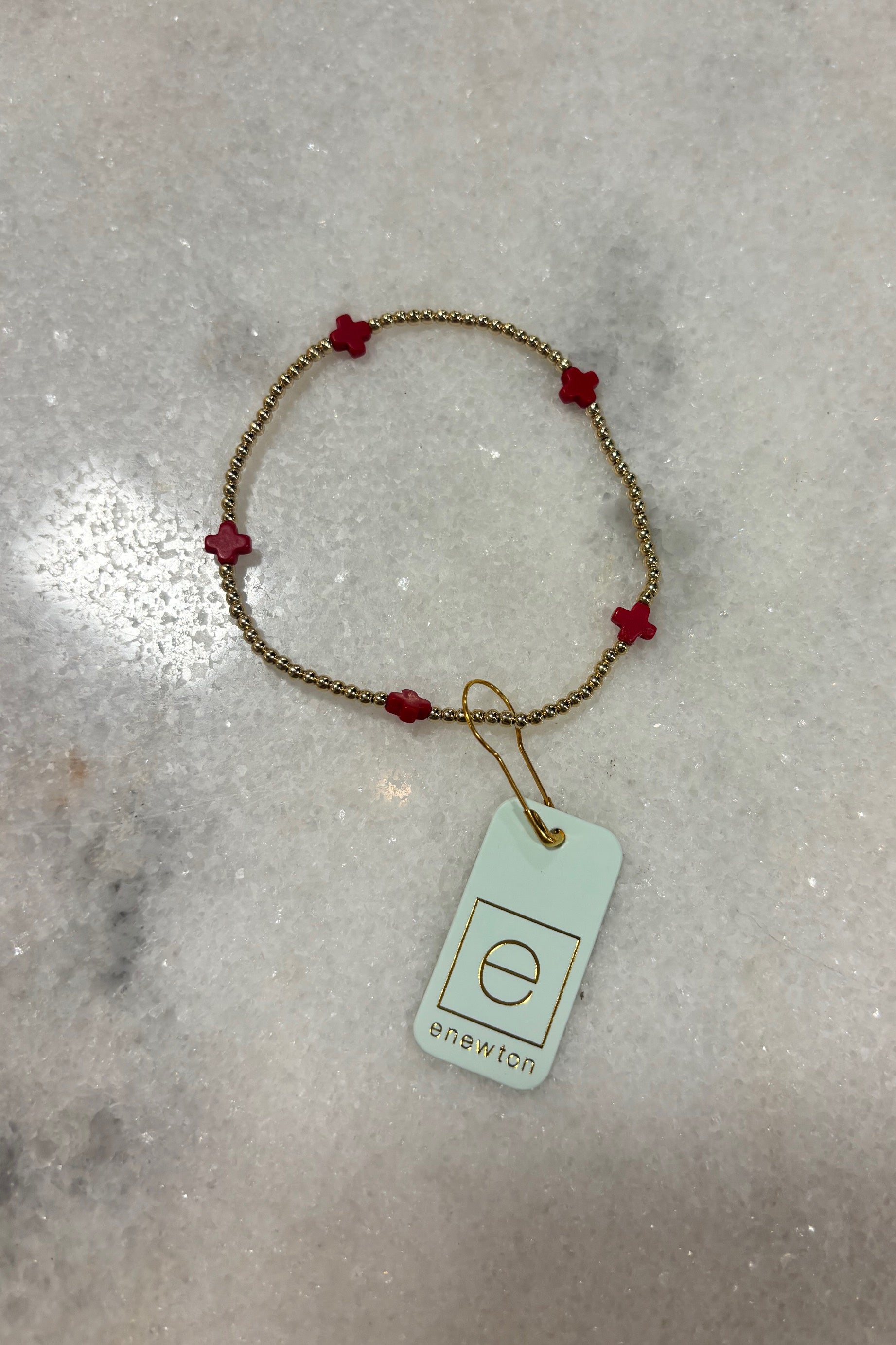 E Newton Signature Cross Small Gold Pattern 2mm Bead Bracelet Red