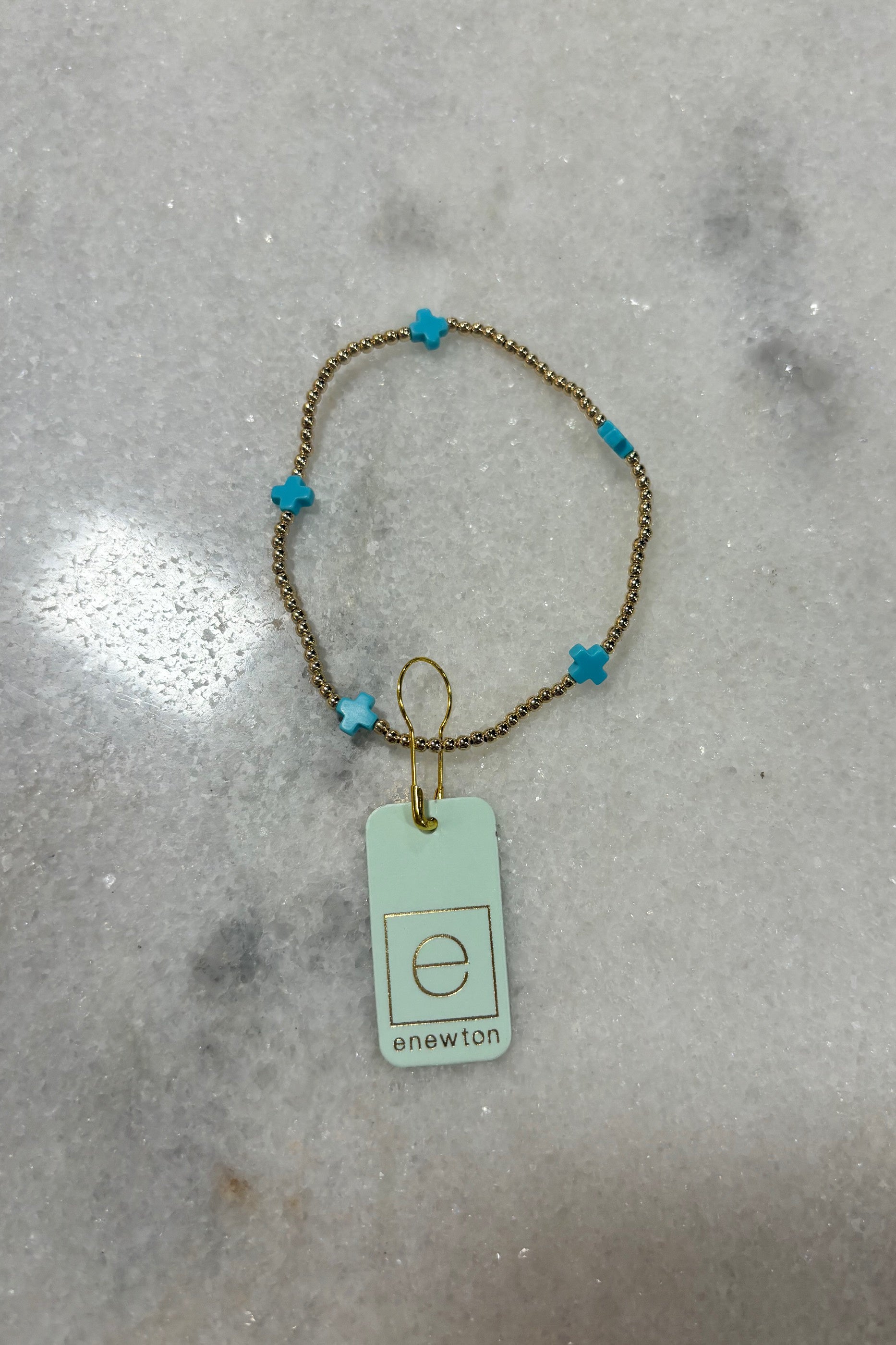 E Newton Signature Cross Small Gold Pattern 2mm Bead Bracelet Turquoise