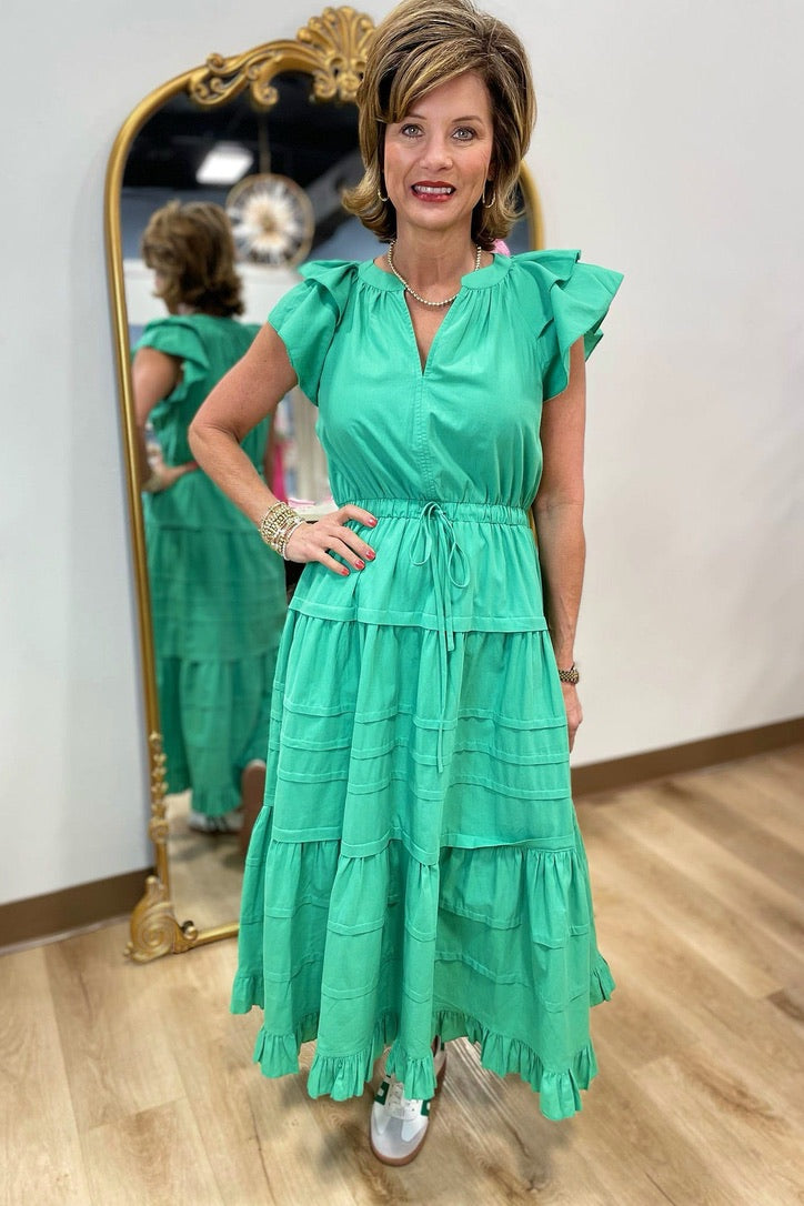 WOVEN MAXI DRESS TIERED PINTUCK DETAILS AT SKIRT FLUTTER SLEEVES MODEL WEARS A SIZE SMALL