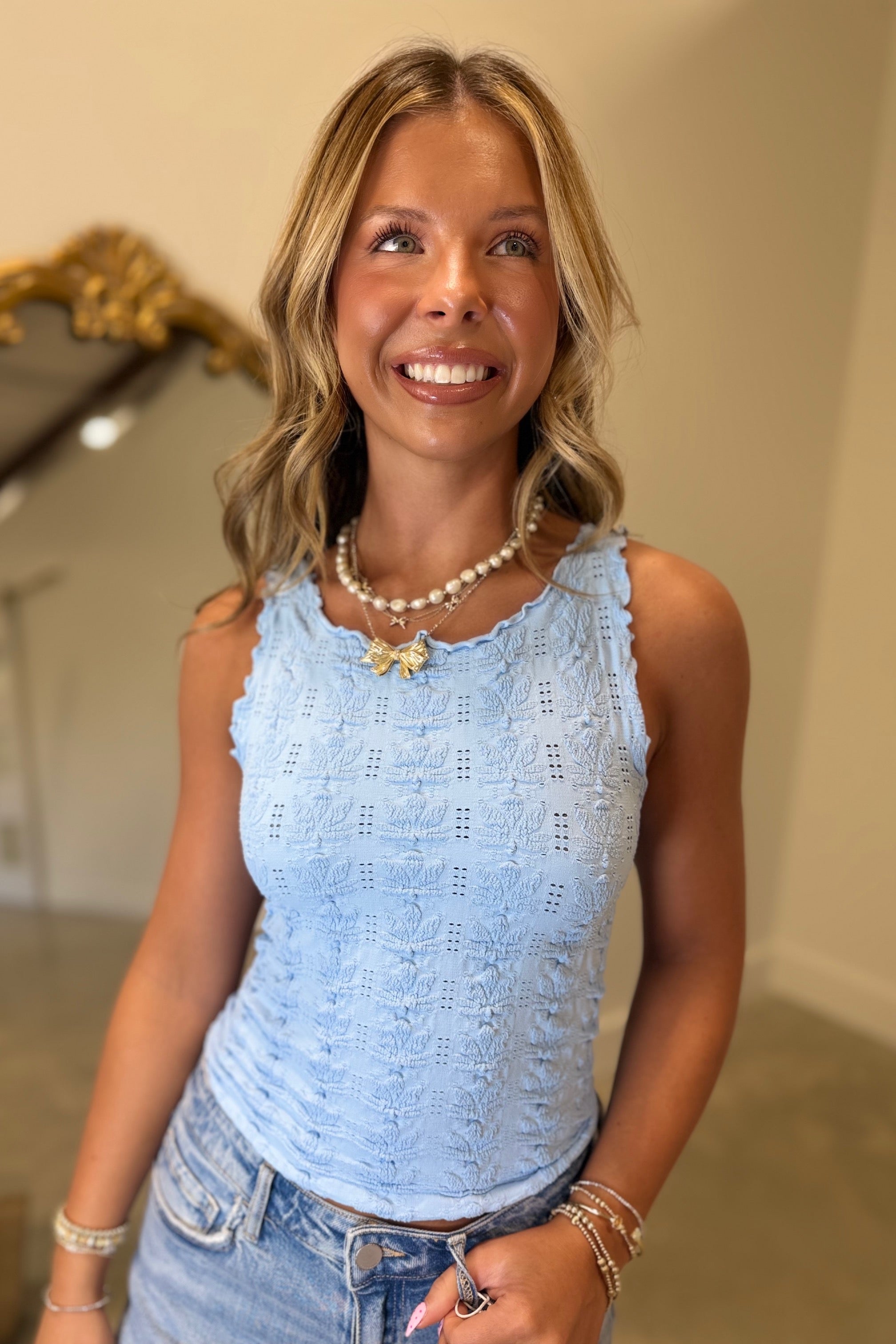 Floral Edge Textured Crop Top Serene Blue One Size