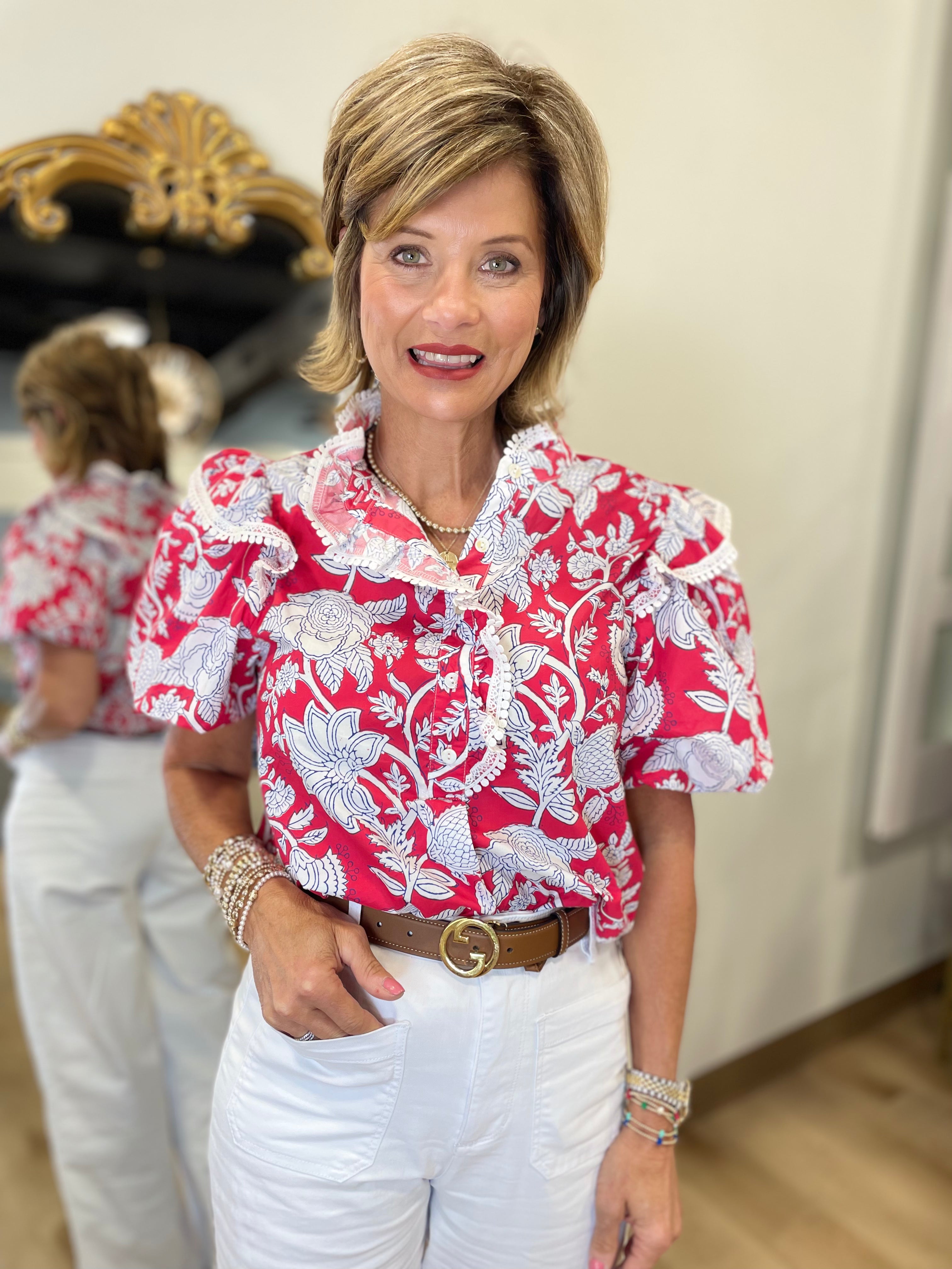 Floral Reverie Blouse w Lace Trim and Puff Sleeves Red