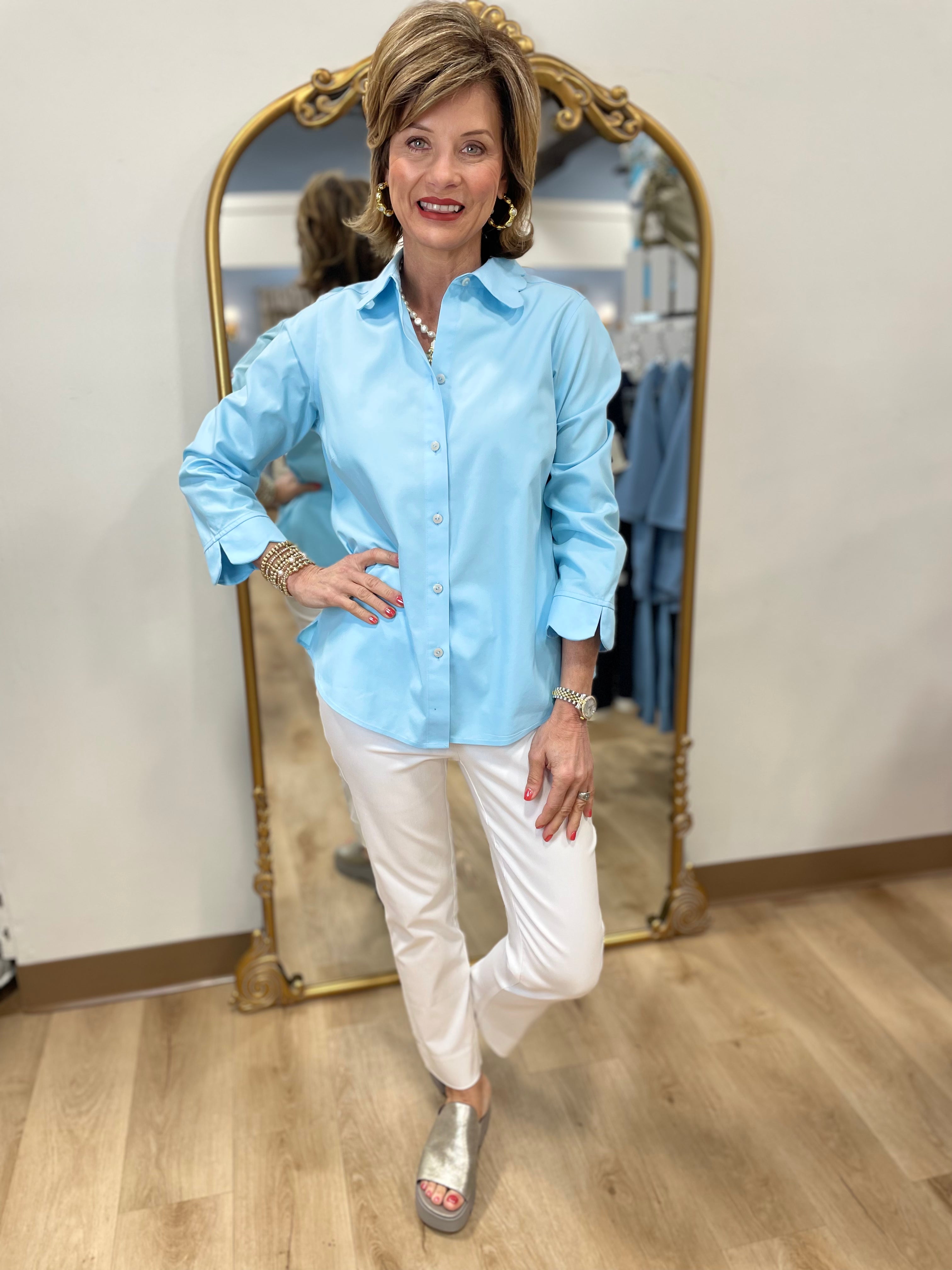 Foxcroft Gwen No Iron Pinpoint 3/4 Sleeve Shirt Aqua