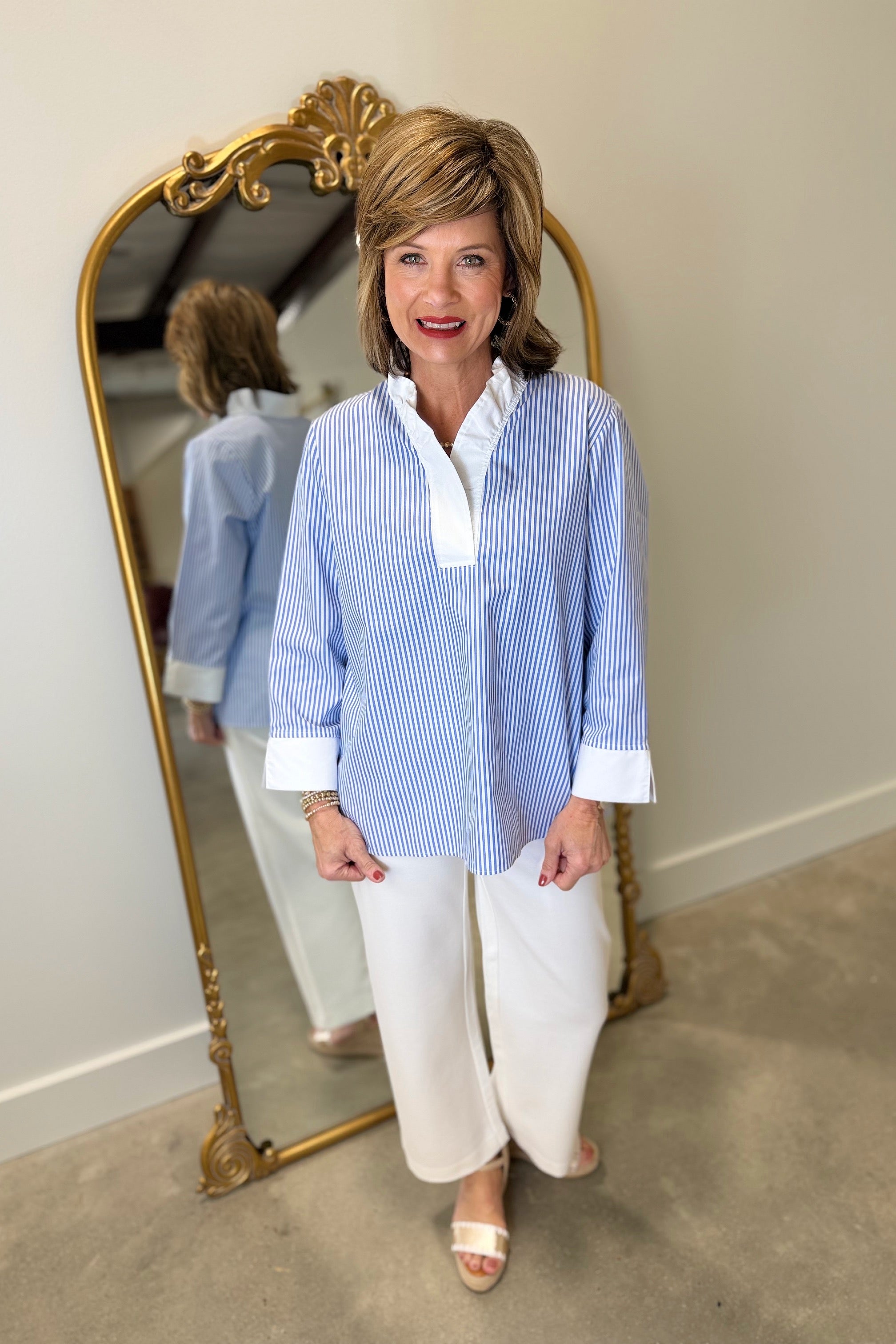 Foxcroft Tammy 3/4 Polo Stripe Blouse Blue