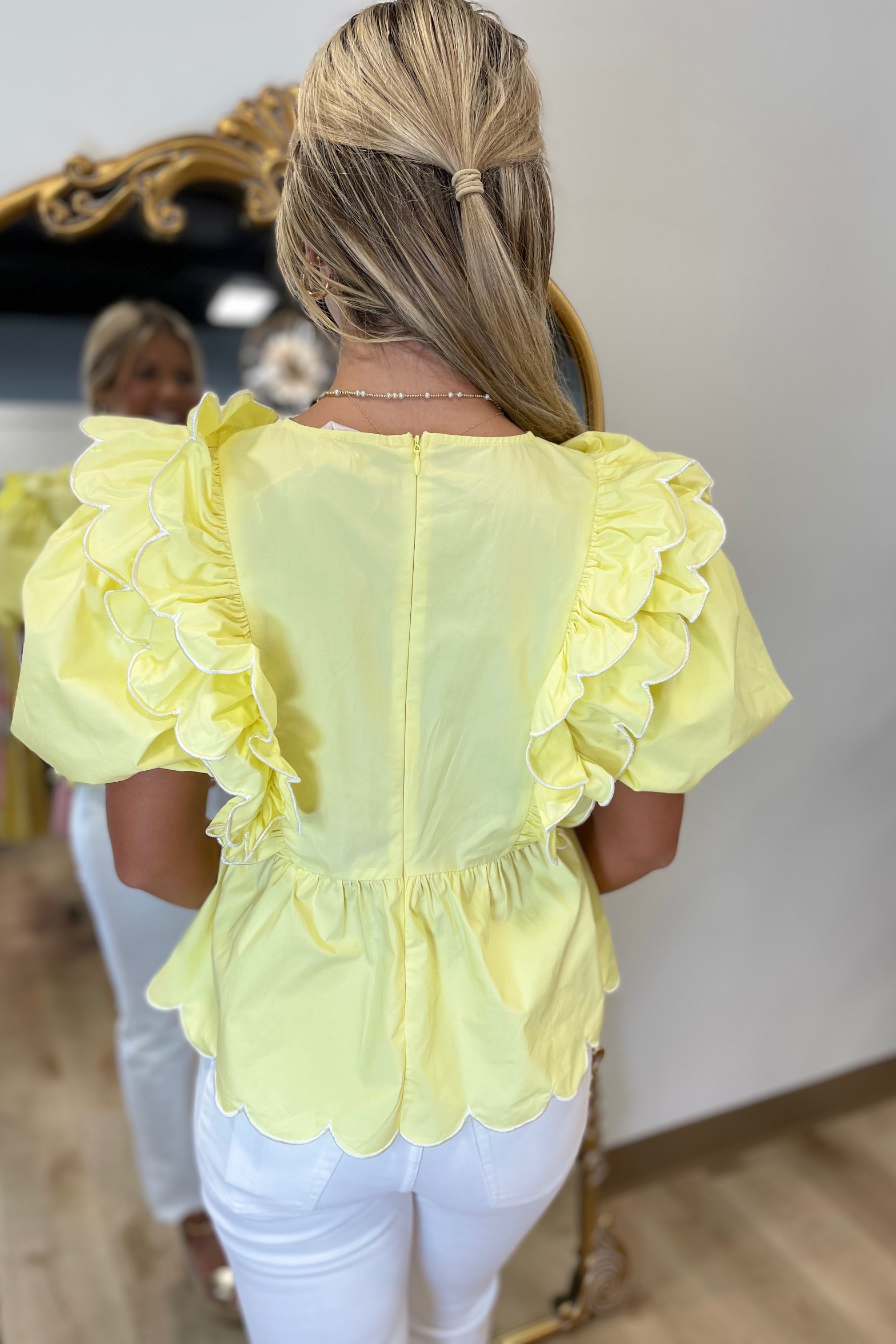 Fresh Squeezed Lemonade Top w Scallop Ruffle & Bubble Sleeve w Back Zipper.