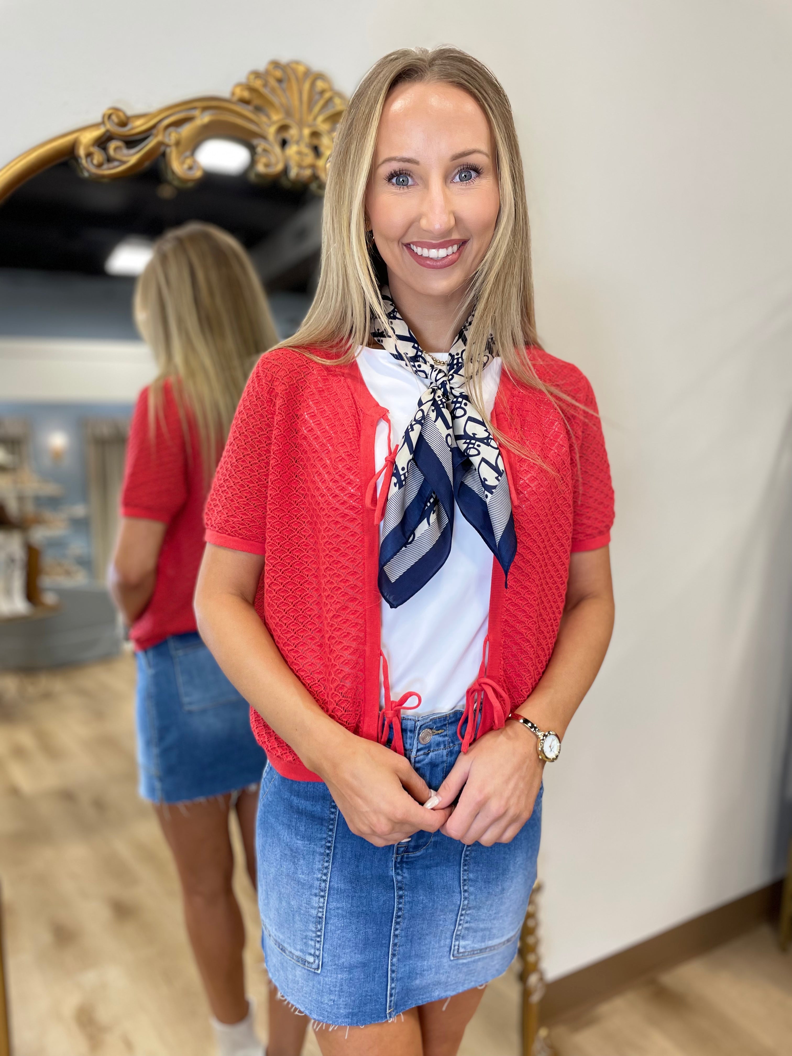 Add a playful pop to your warm-weather wardrobe with the Aelis Top by FRNCH. This lightweight cotton knit features a breezy openwork design, flirty tie-front closures, and short sleeves for an effortlessly cool silhouette. The bold red hue adds the perfect dose of confidence to your everyday style—whether worn over a bralette, tank, or layered with your favorite dress.