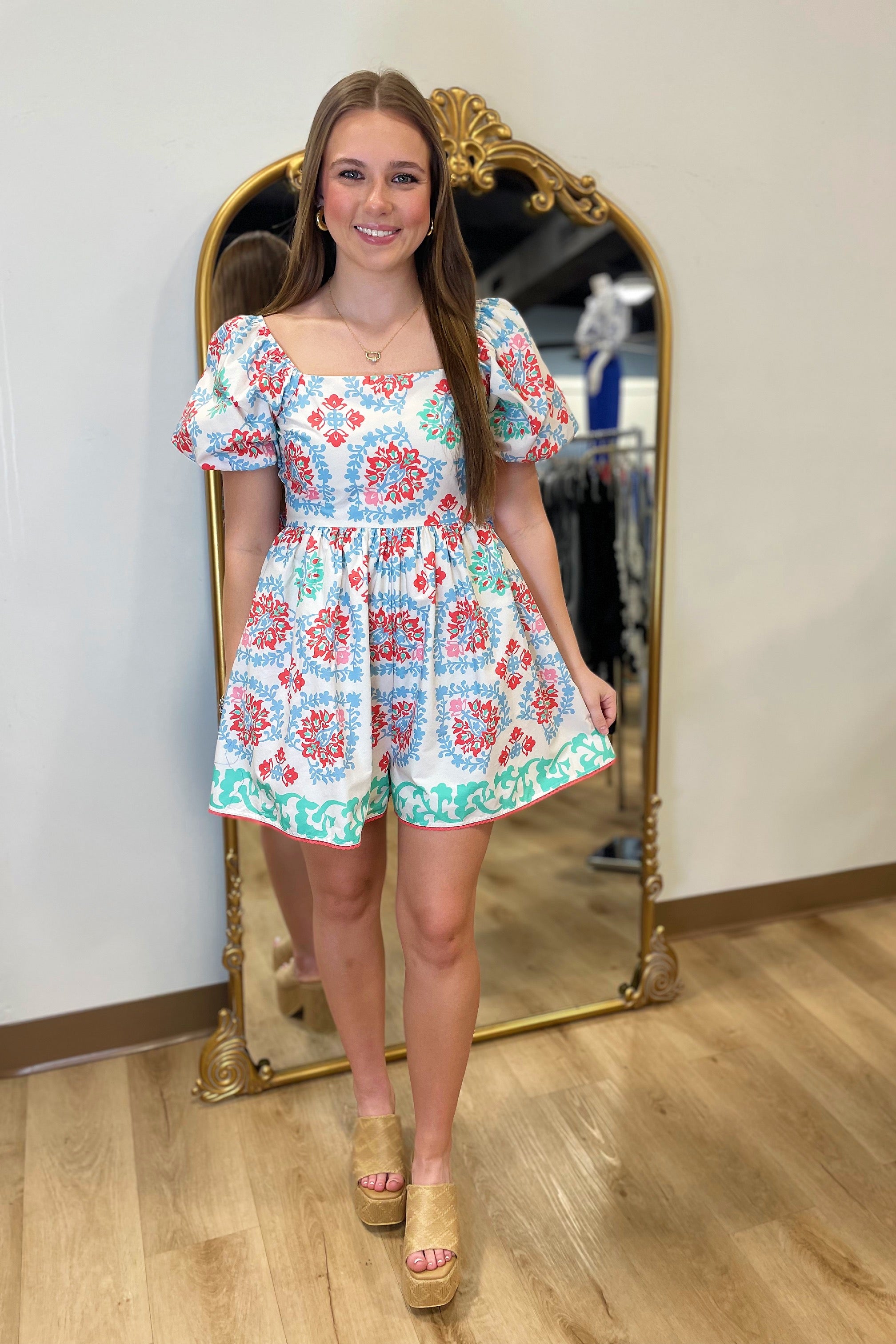 Garden of Muse Romper w Bubble Sleeve Belt & Smocked Back Ivory Print.