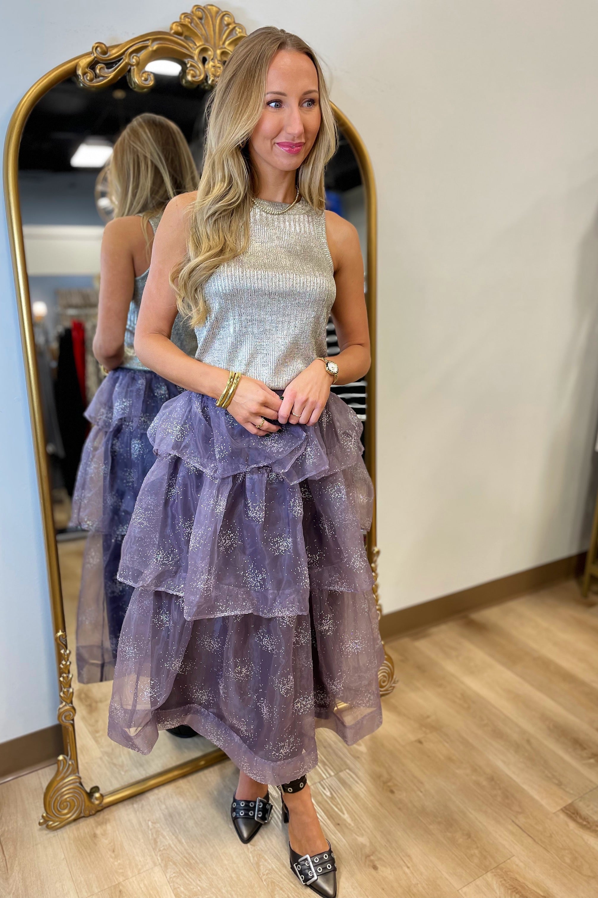 Glitter Tiered Organza Midi Skirt Deep Purple