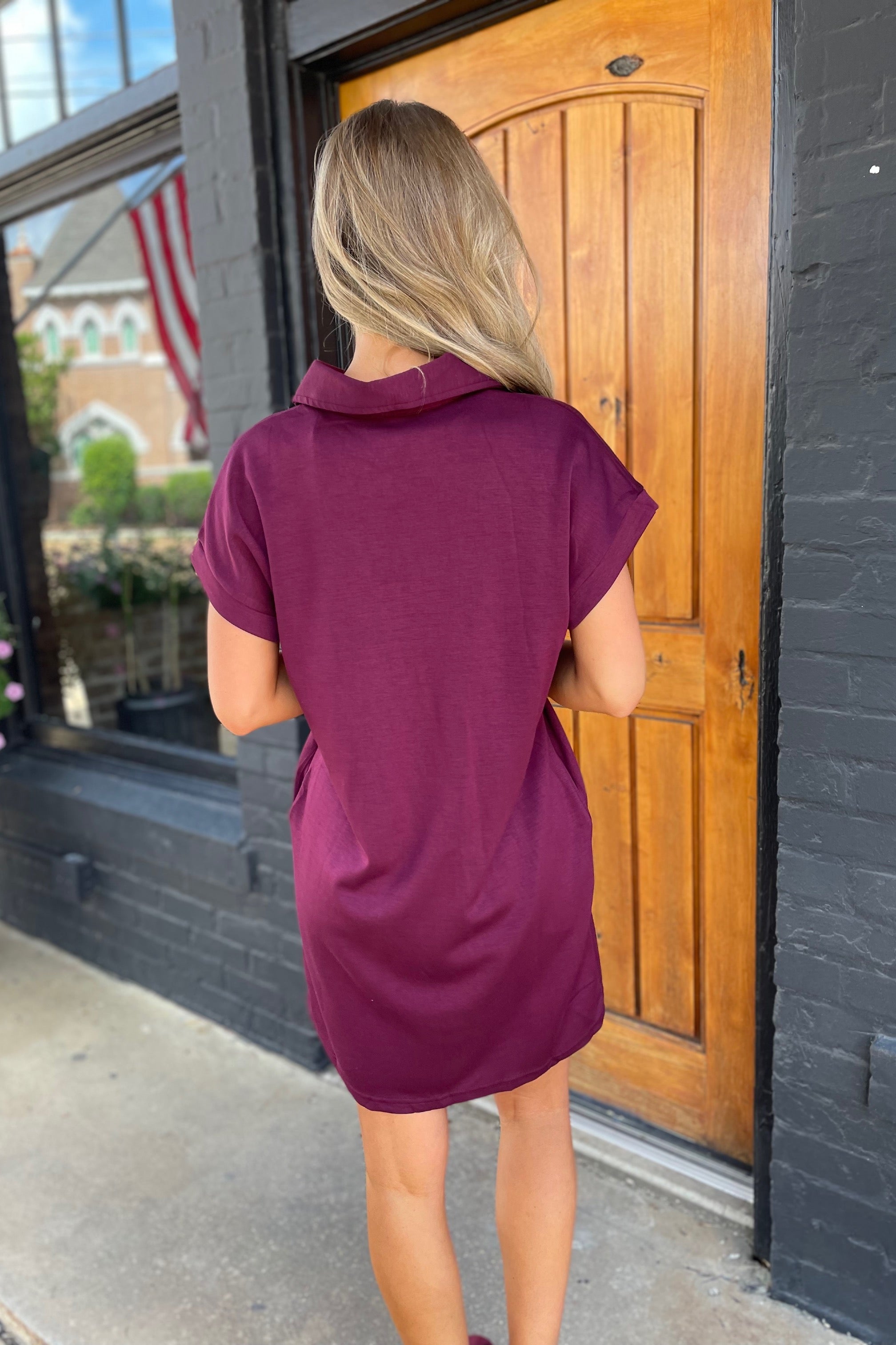 Solid spread collar V-neck pullover mini dress. Side pockets. Unlined. Knit. Non-sheer. Lightweight.