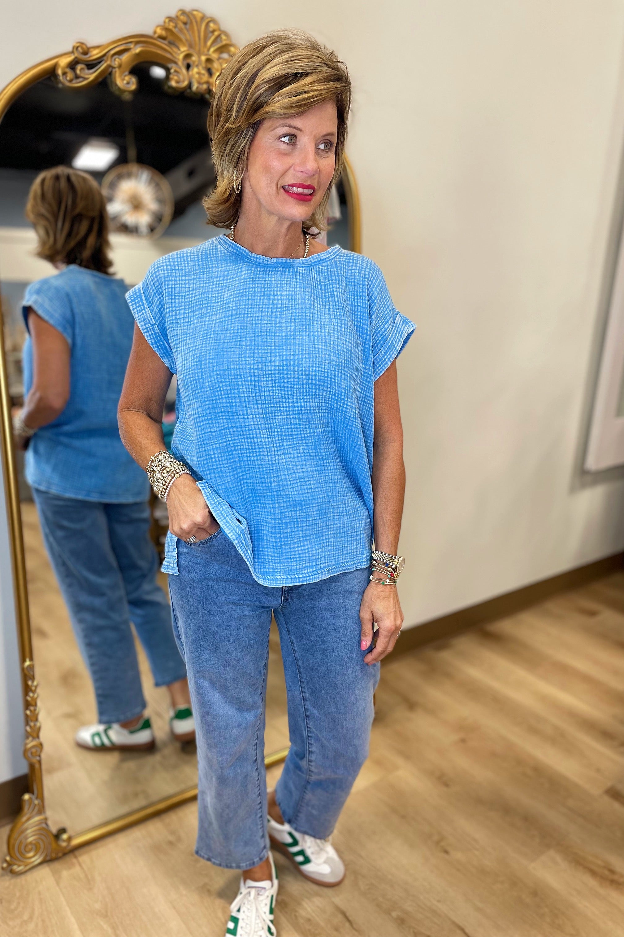 Going w Gauze Acid Washed Top Blue
