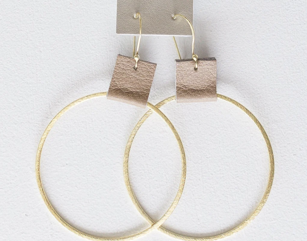Faves! X Large (2.4 inches) brushed gold tone hoop with a small touch of distressed leather.