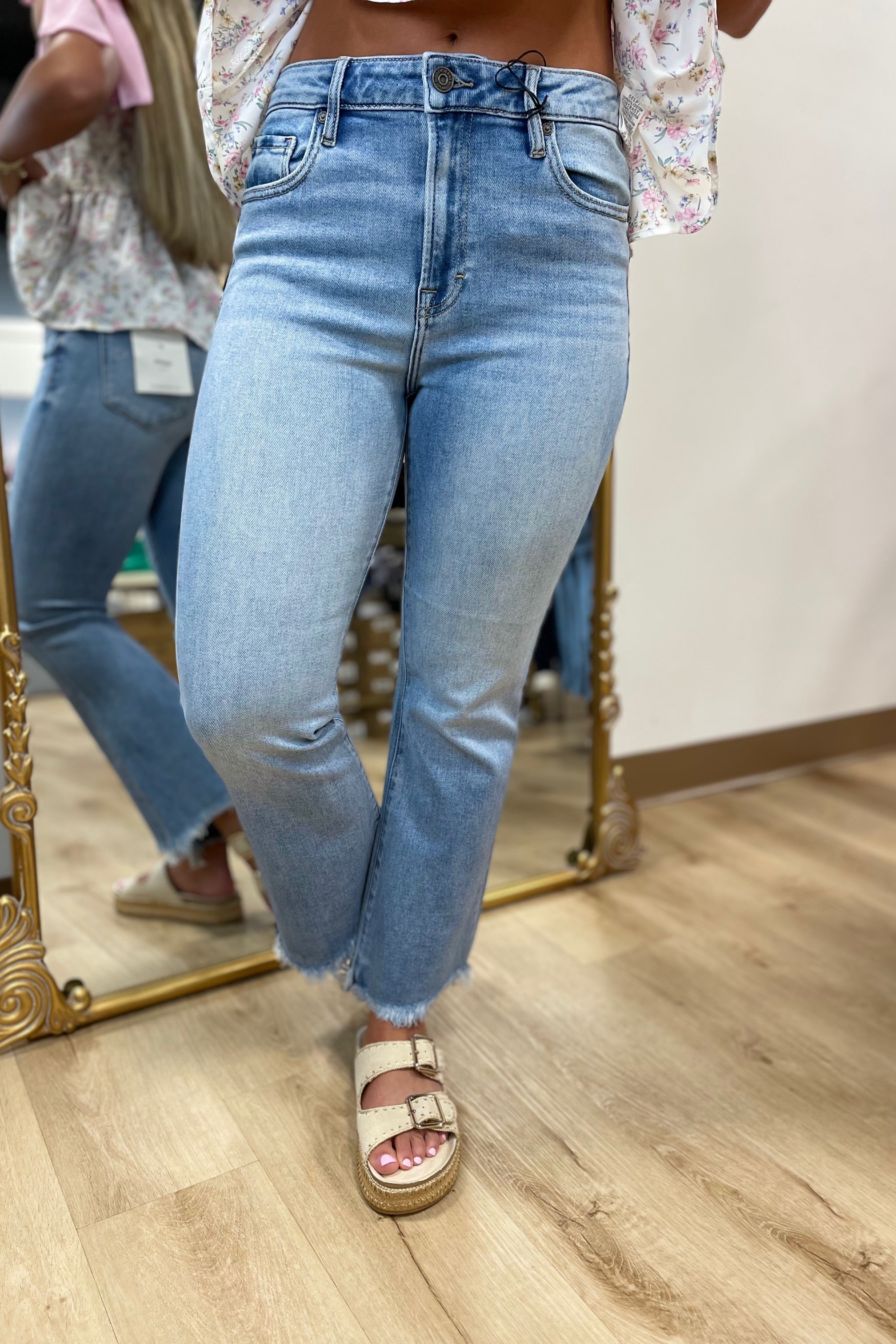 Hidden Happi 27" Inseam High Waist Super Fray Crop Flare Light Wash.