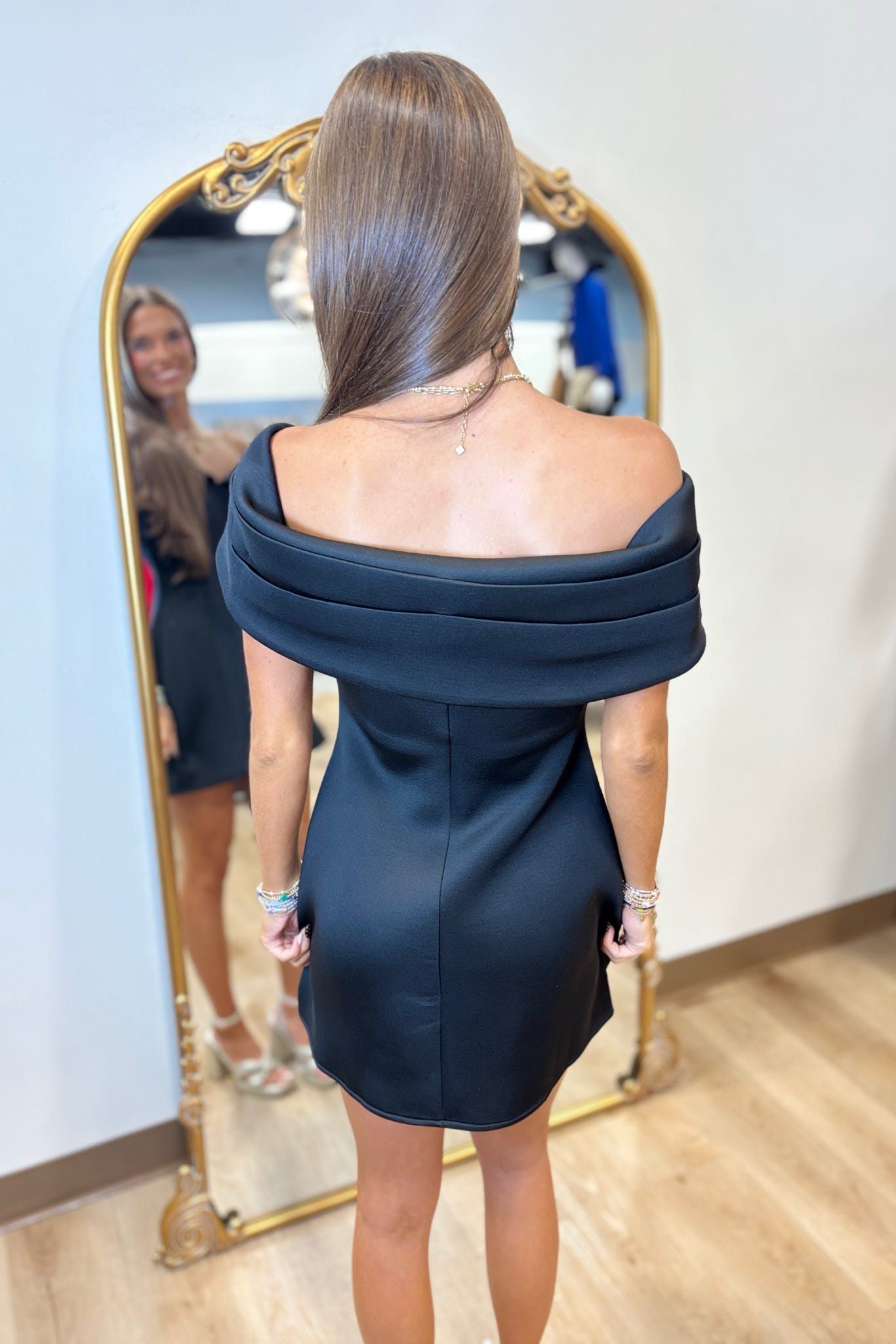 Scuba off shoulder fold over neckline pullover mini dress. Lining.