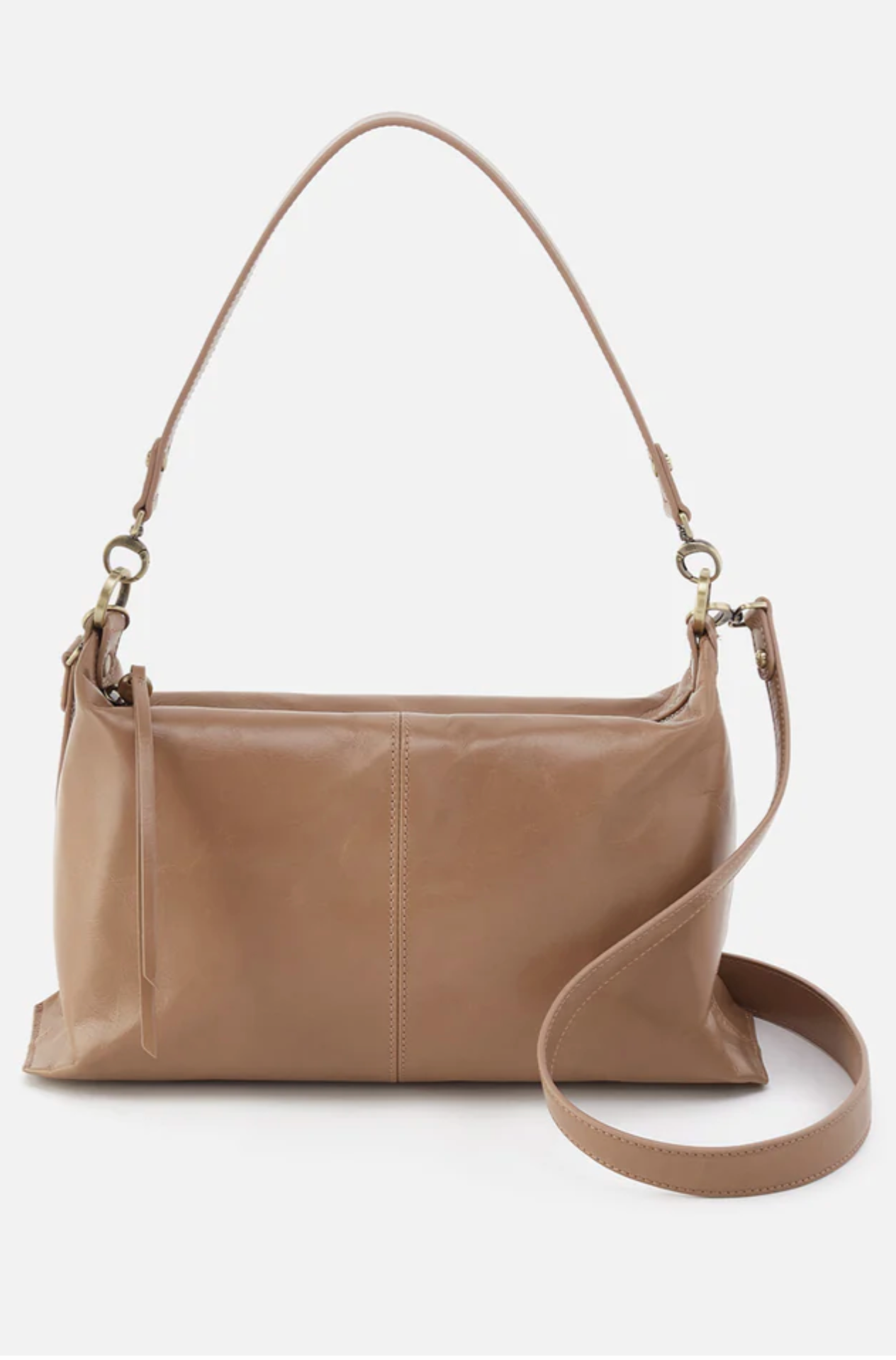 A leather bag with removable shoulder and crossbody straps.