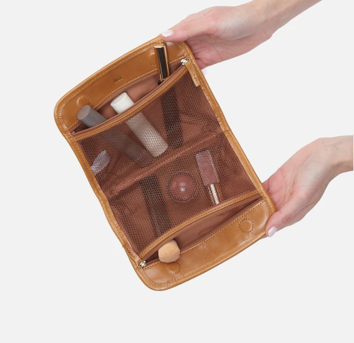 Beauty has a magnetic closure and two zipper mesh pockets for storing your items.