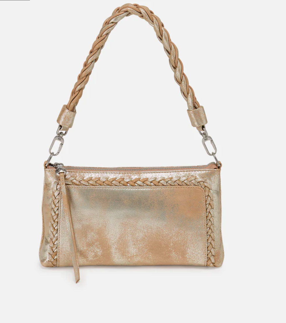 A convertible HOBO style that can be worn three ways: crossbody, baguette bag and wristlet.