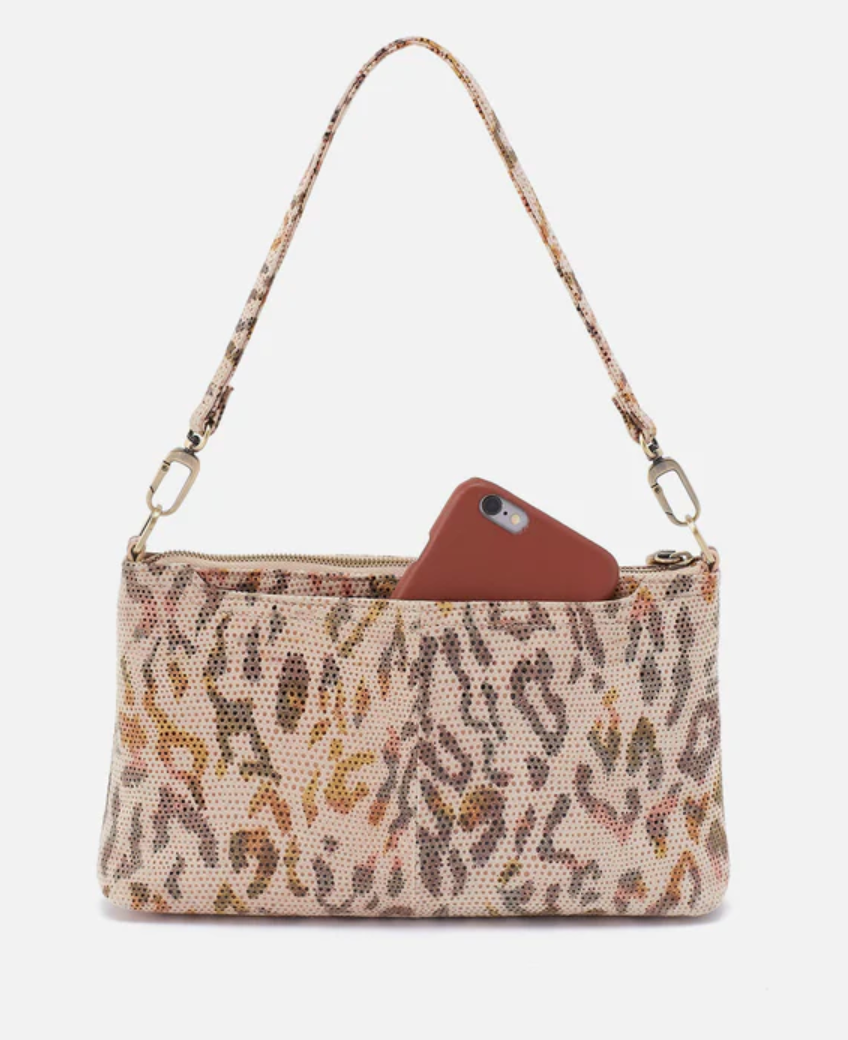 A convertible HOBO style that can be worn three ways: crossbody, baguette bag and wristlet.