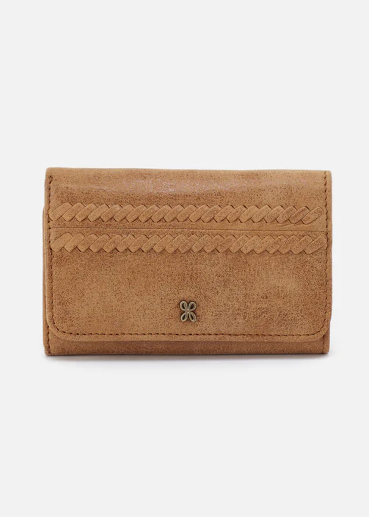 A trifold wallet with a magnet closure.