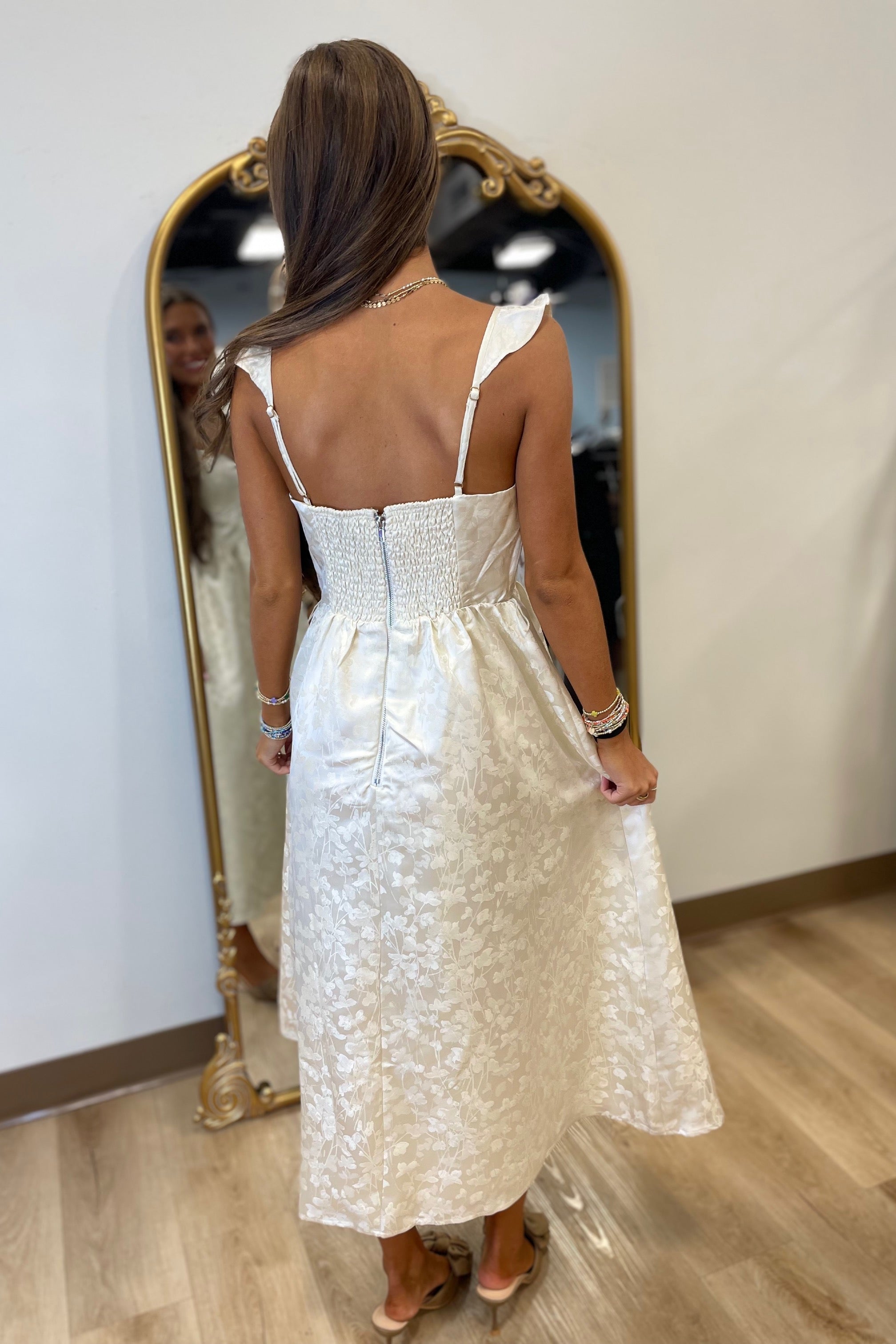Ivory Elegance Floral Jacquard Midi Dress w Bow Details Cream