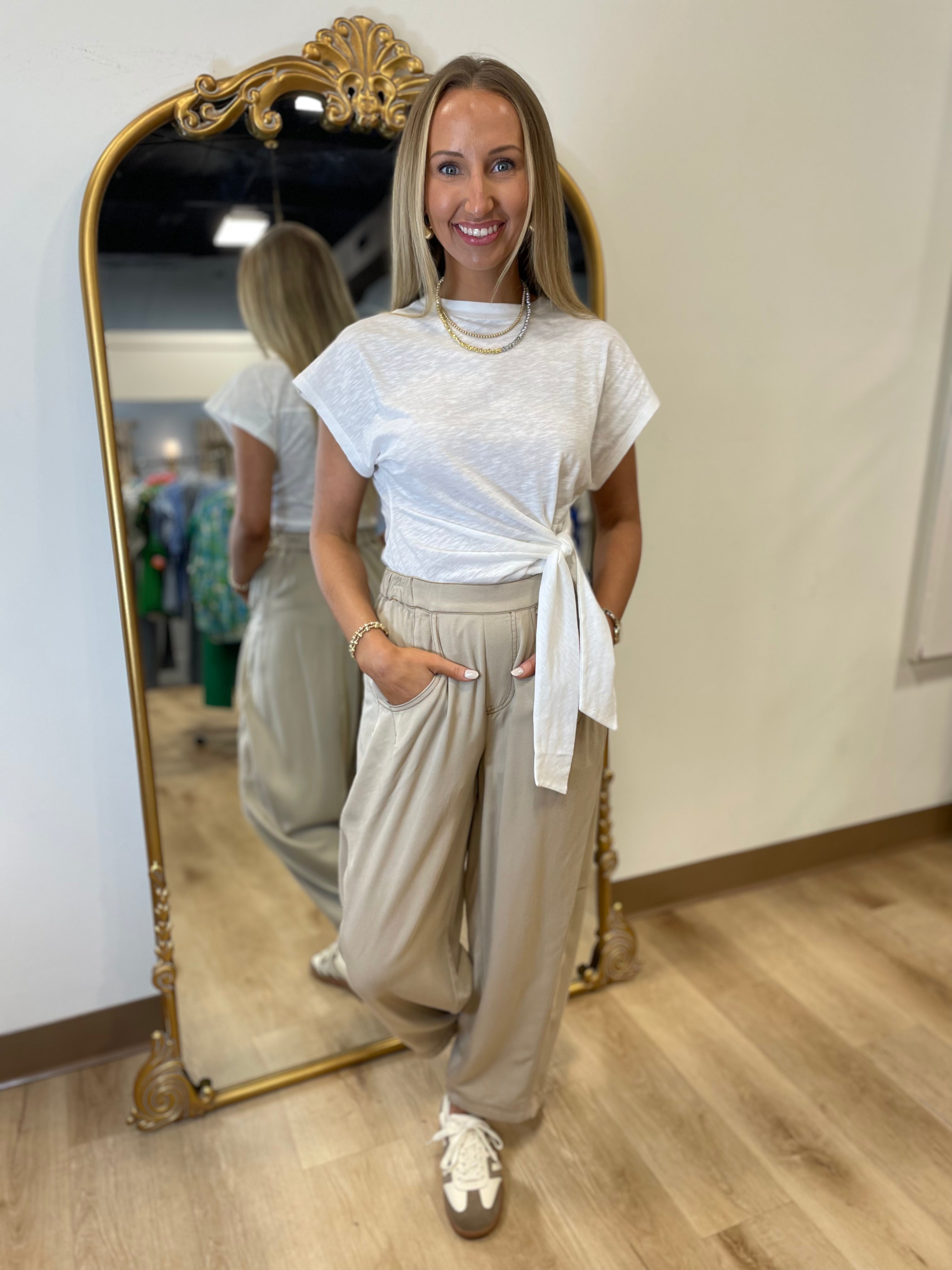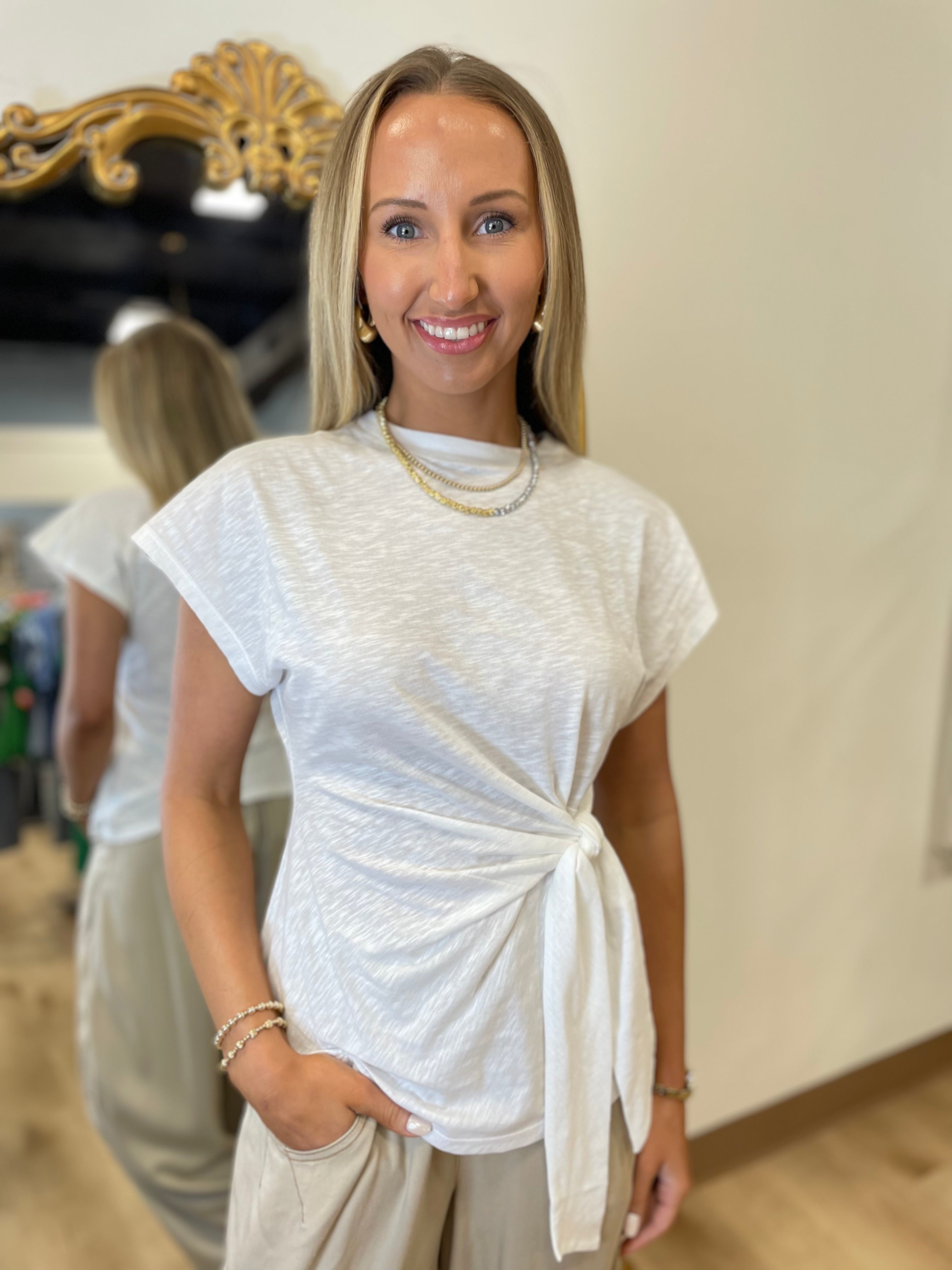 The Jen Tee: an oversized tee with dropped shoulders for a relaxed fit, and a playful side tie detail. Keep it casual and fun with this tee!