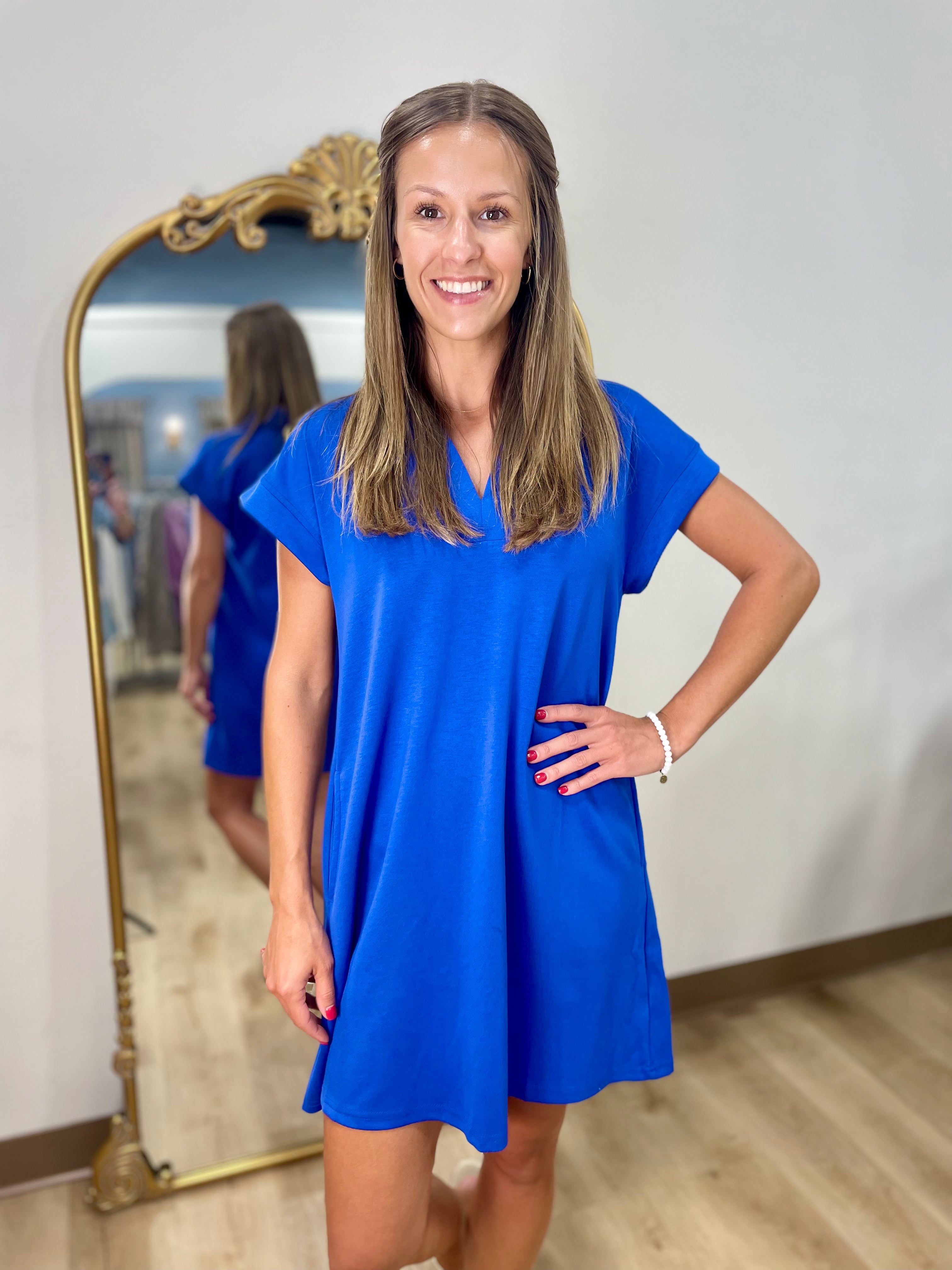 Just Hanging Out Super Soft Short Sleeve Dress w Split Collared Neck Royal