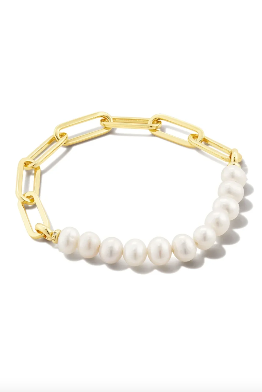 Get the best of both worlds in the Ashton Gold Half Chain Bracelet in White Pearl. Half modern link chain and half elevated stones. this bracelet will be the most versatile piece in your collection. Pair it with simple pearl studs for a complete look or add other modern chains for a trend-forward style.