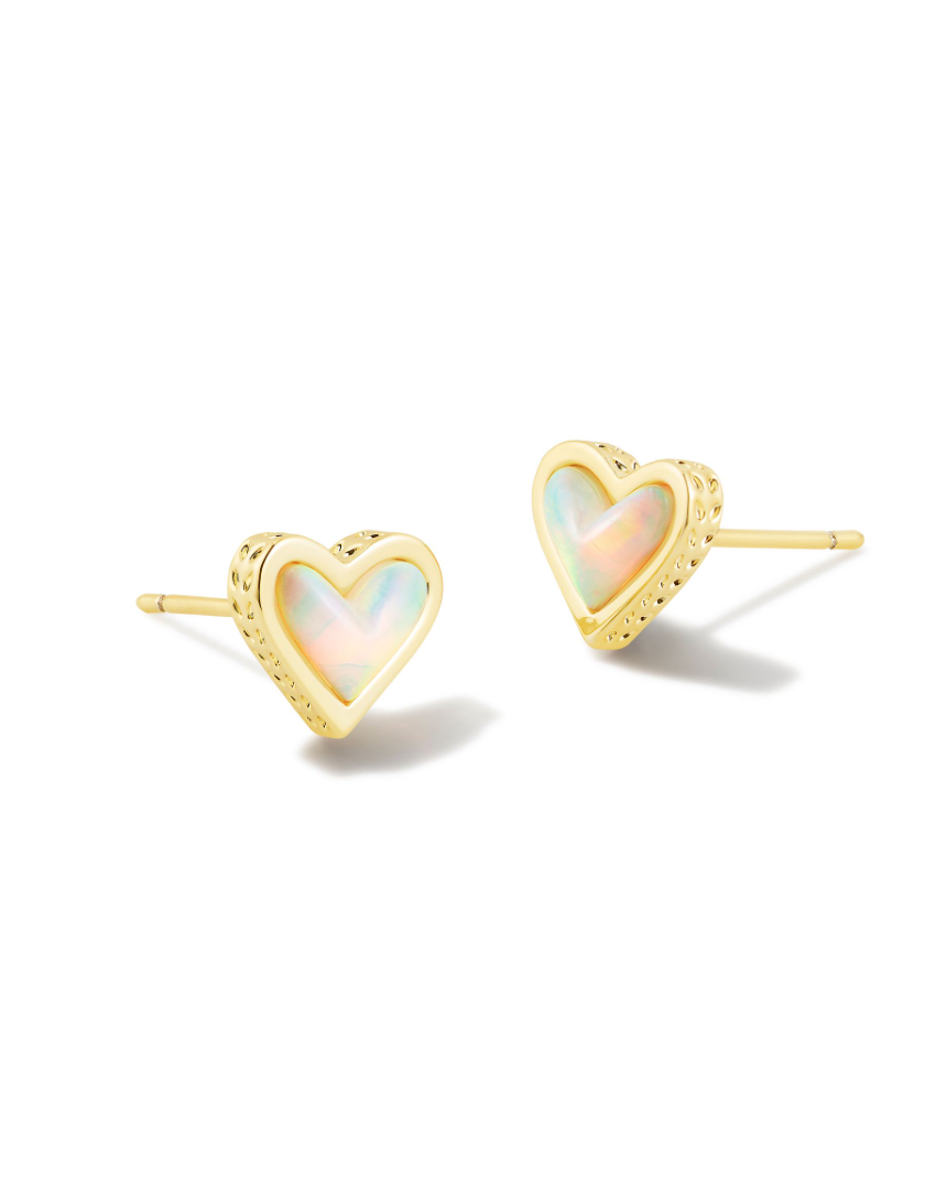 It’s only a matter of time before you fall for the Framed Ari Heart Gold Stud Earrings in White Opalescent Resin. A slightly updated version of our fan-favorite silhouette, these studs feature a smaller heart shape and a sleek metal frame embellished with our signature hoofprint detailing. Fun, flirty, and feminine, these sweet heart earrings are always a good idea.