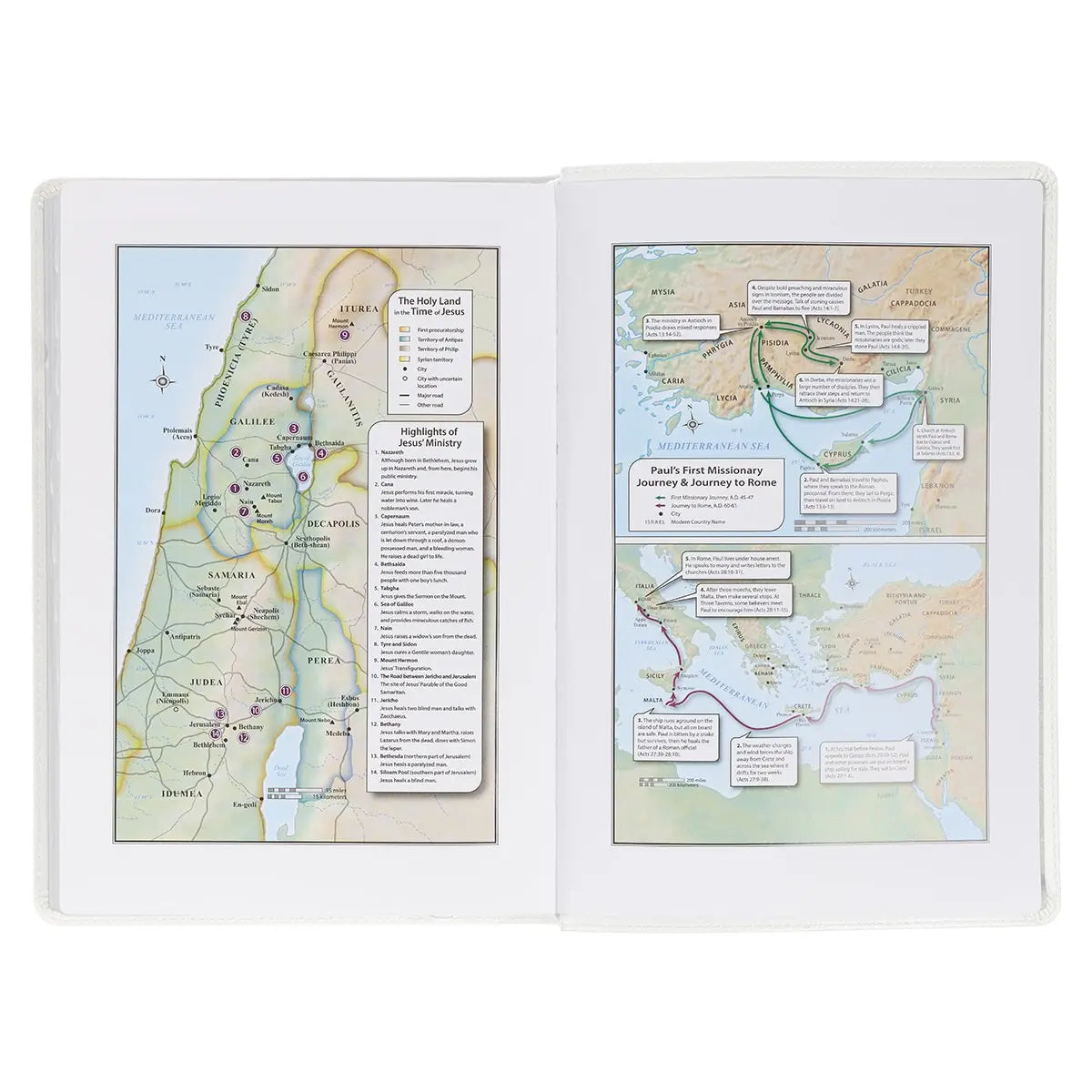 Celebrate the sacraments, rites and ceremonies of the Church with the White Faux Leather Large Print Thinline KJV Bible with Thumb Index! Whether you are celebrating a baptism, confirmation, church membership, first communion, christening, or wedding, the pure white KJV Bible will mark your rite of passage in a meaningful and memorable way. Both the Old and New Testament printed in the Classic King James text are included in the Bible. The easier-to-read 10-pt text and reader-friendly sub-headings will improve reading speed and ease for both young and old alike. The text is organized in a double-column format with clearly marked chapter and verse numbers, and the words of Christ are printed in red for easy reference.