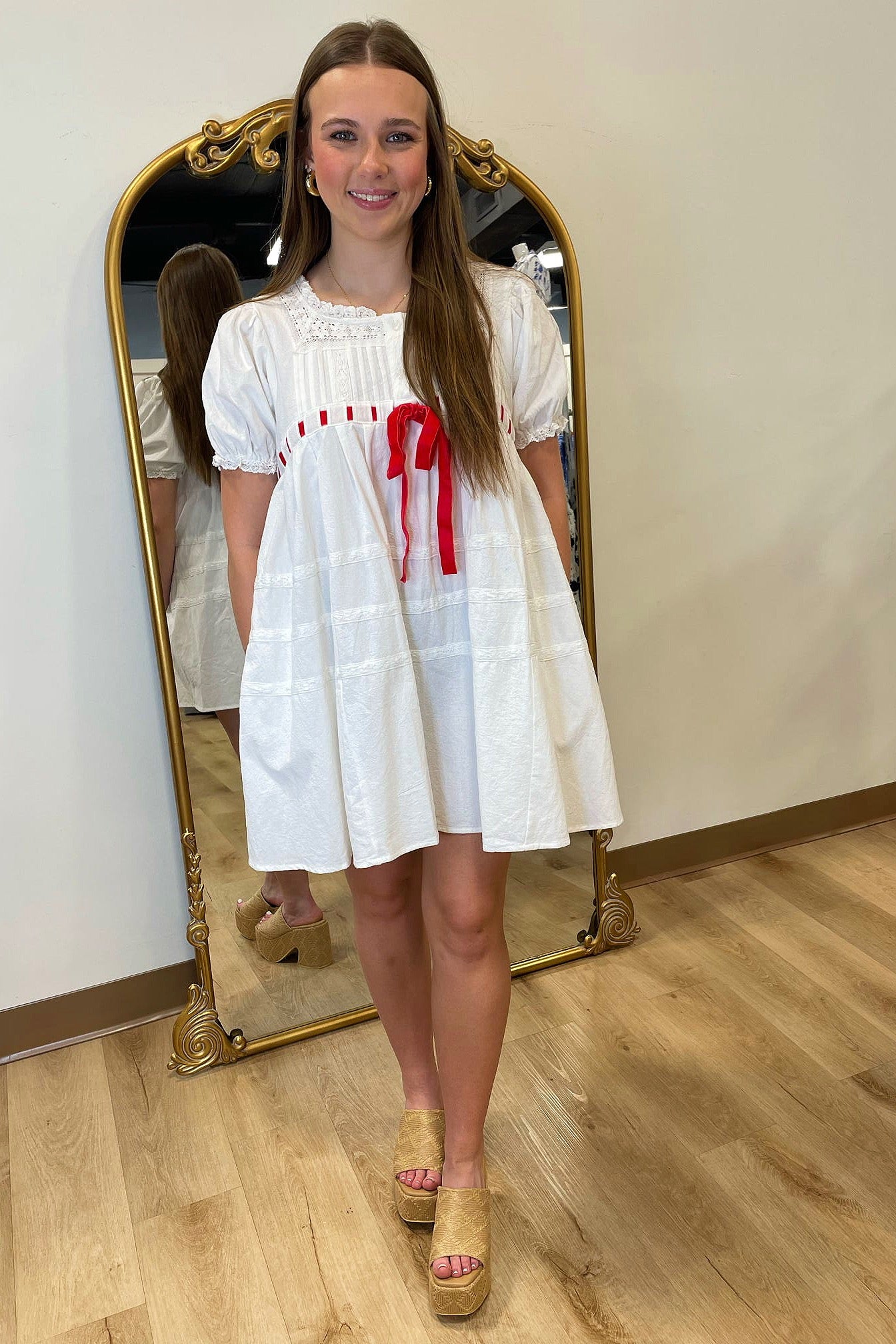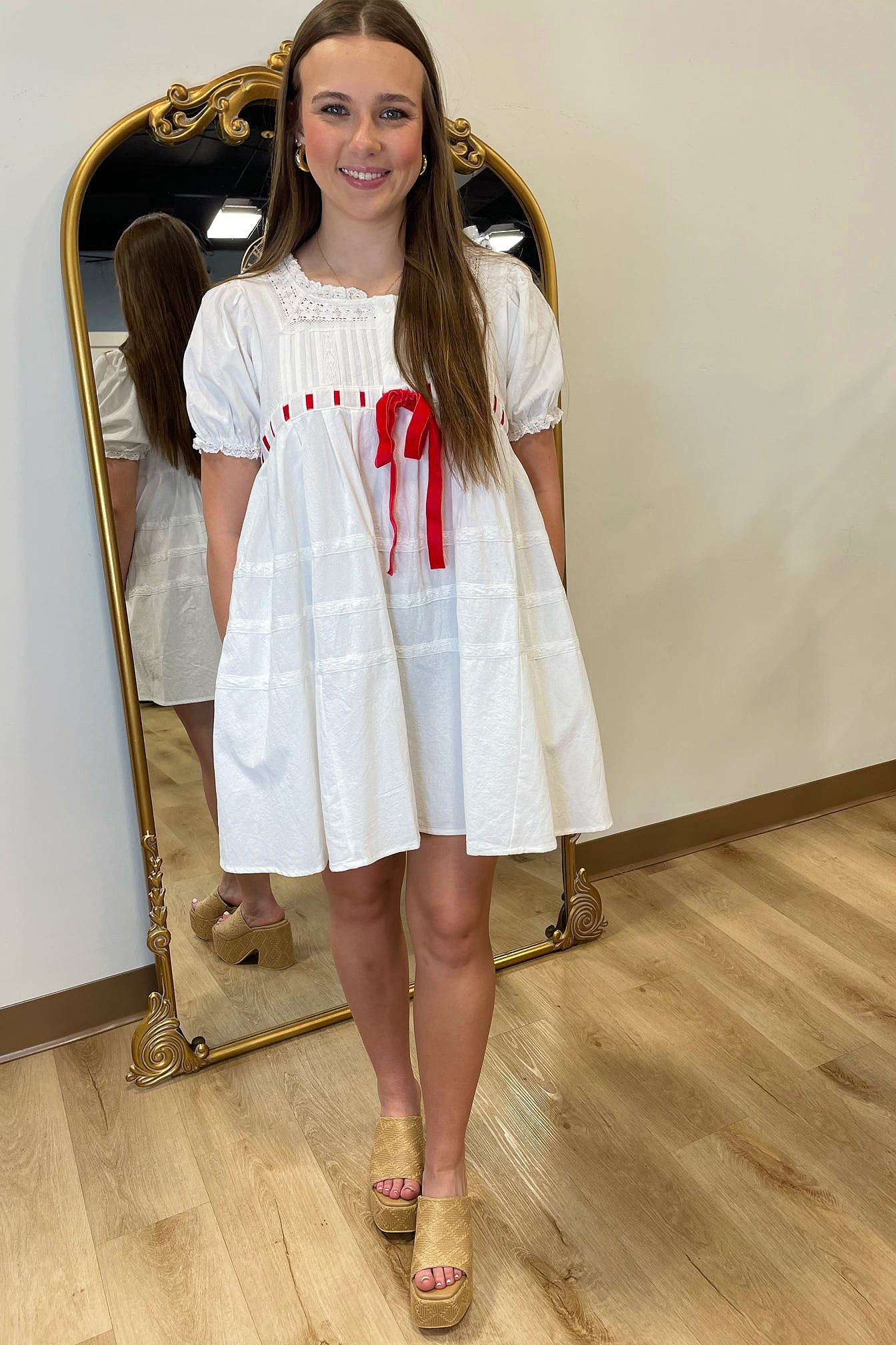 LIBERTY BOW DRESS WHITE. RED VELVET TIE