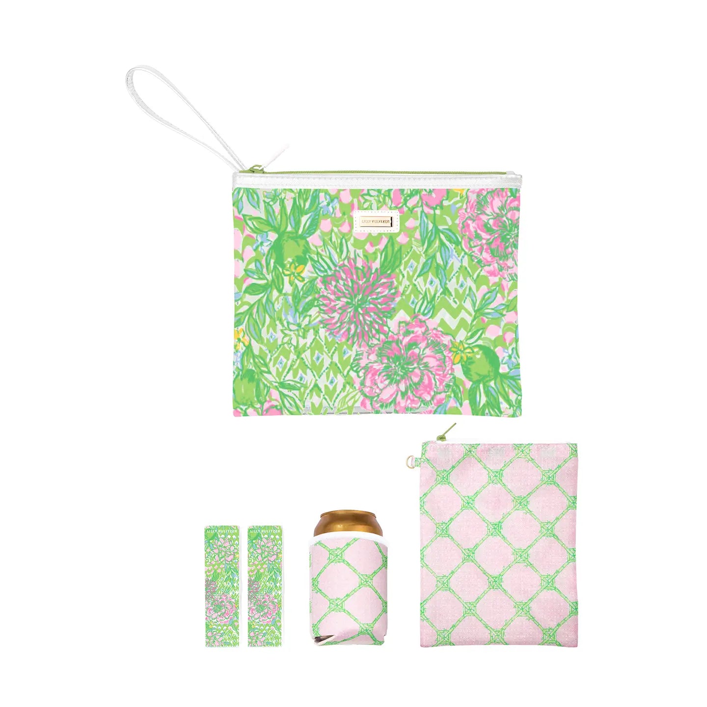 Pack light and stay stylish for fun in the sun with the Lilly Pulitzer Beach Day Pouch. This colorful essential keeps your beach-day must-haves organized in true Lilly fashion. Crafted from durable, wipeable material and adorned with a playful Lilly print, this zippered pouch is as practical as it is chic. Inside, you’ll find a matching drink hugger and a set of beach towel clips—the perfect accessories for sunny days spent seaside or poolside. A gold Lilly logo plaque adds the finishing touch of sophistication, making this pouch both fashionable and functional. Whether used to stash your keys, phone, or small essentials, this beach-ready pouch ensures you’re organized, coordinated, and ready to shine wherever the day takes you.