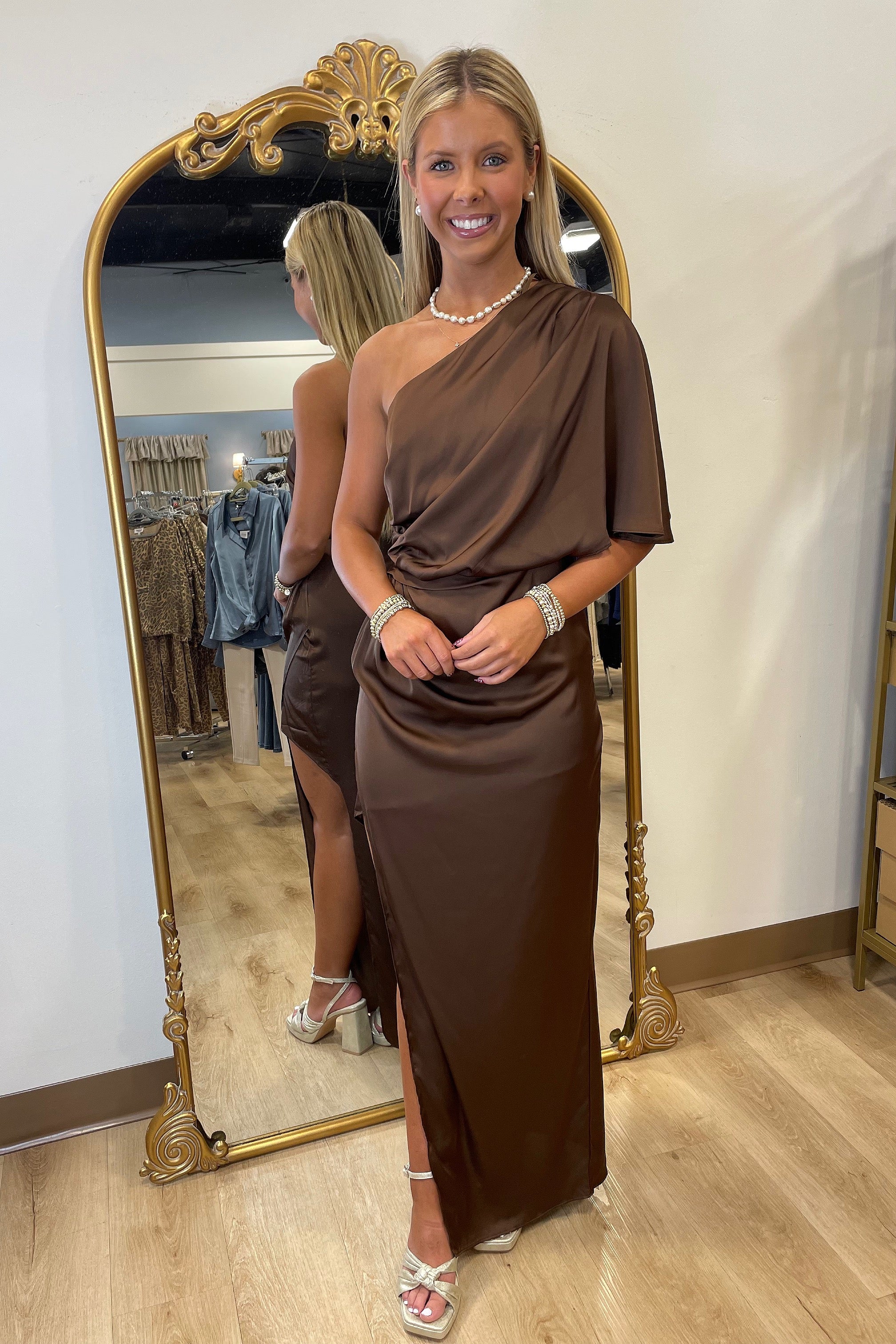 Luxe Love One-shoulder Side-slit Maxi Dress Brown