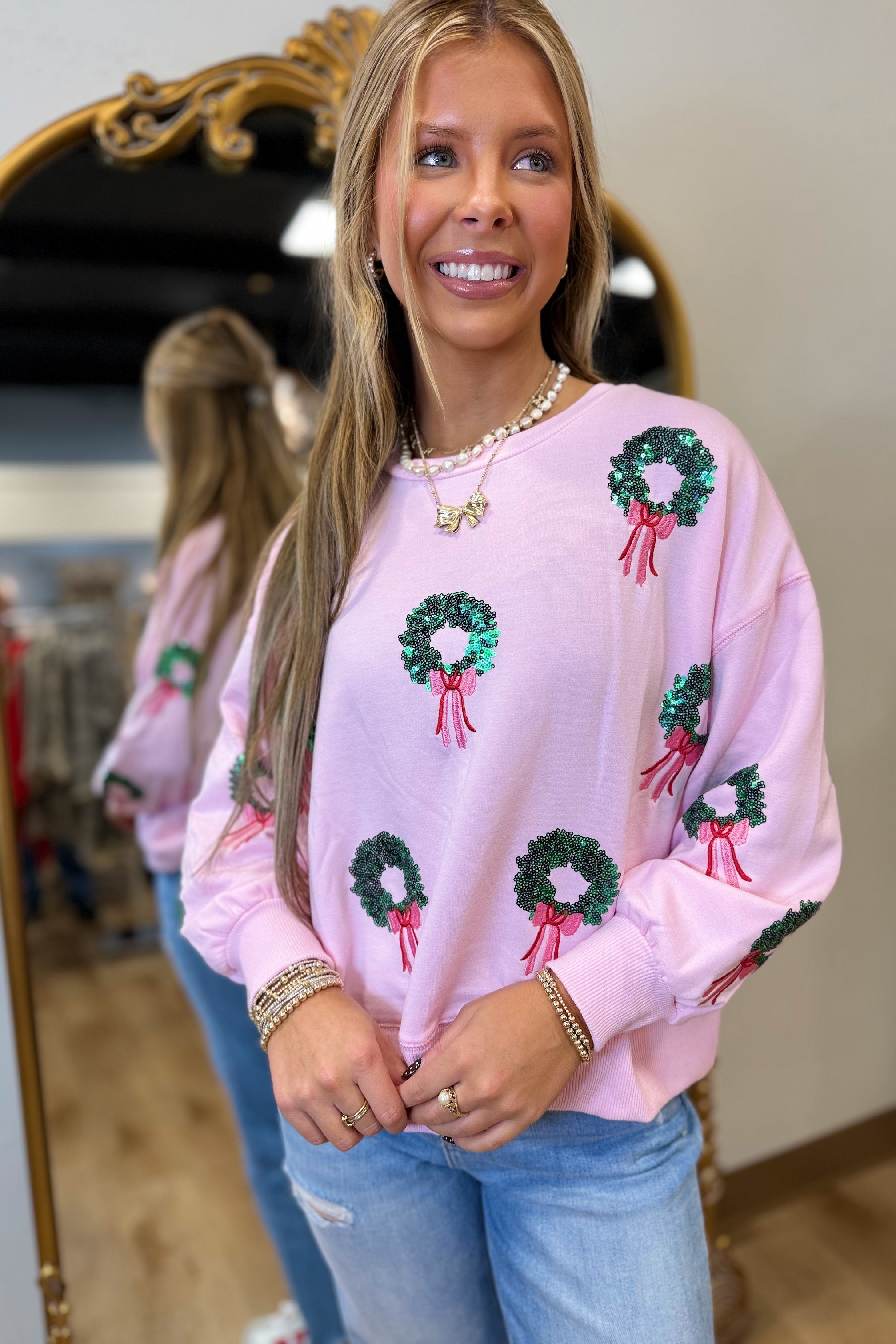 Mary Square Sequin Wreaths Sweatshirt Pink