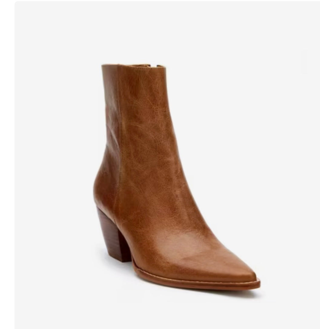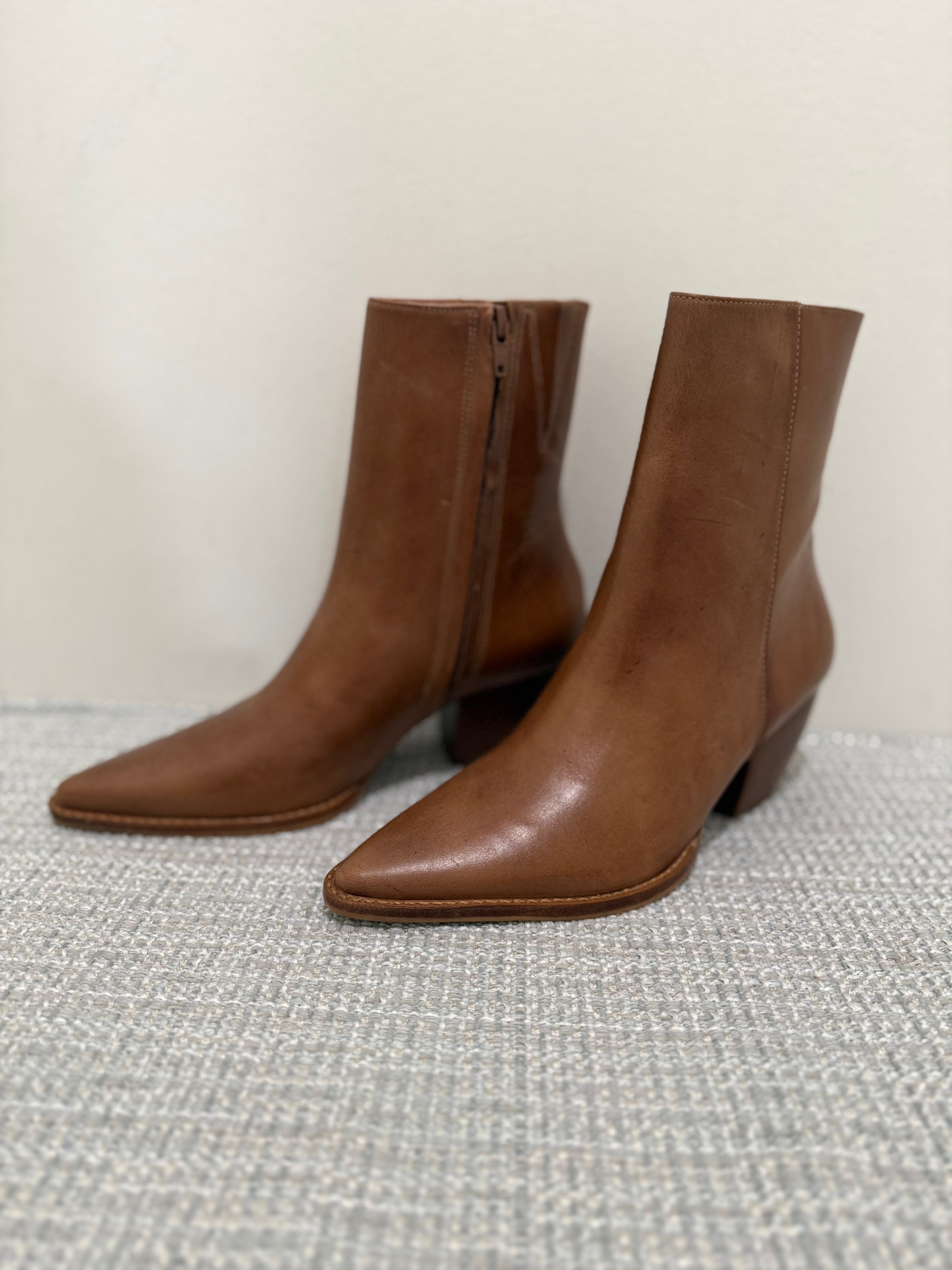 A versatile ankle boot featuring a sleek pointed toe, stacked block heel, and minimalist silhouette.