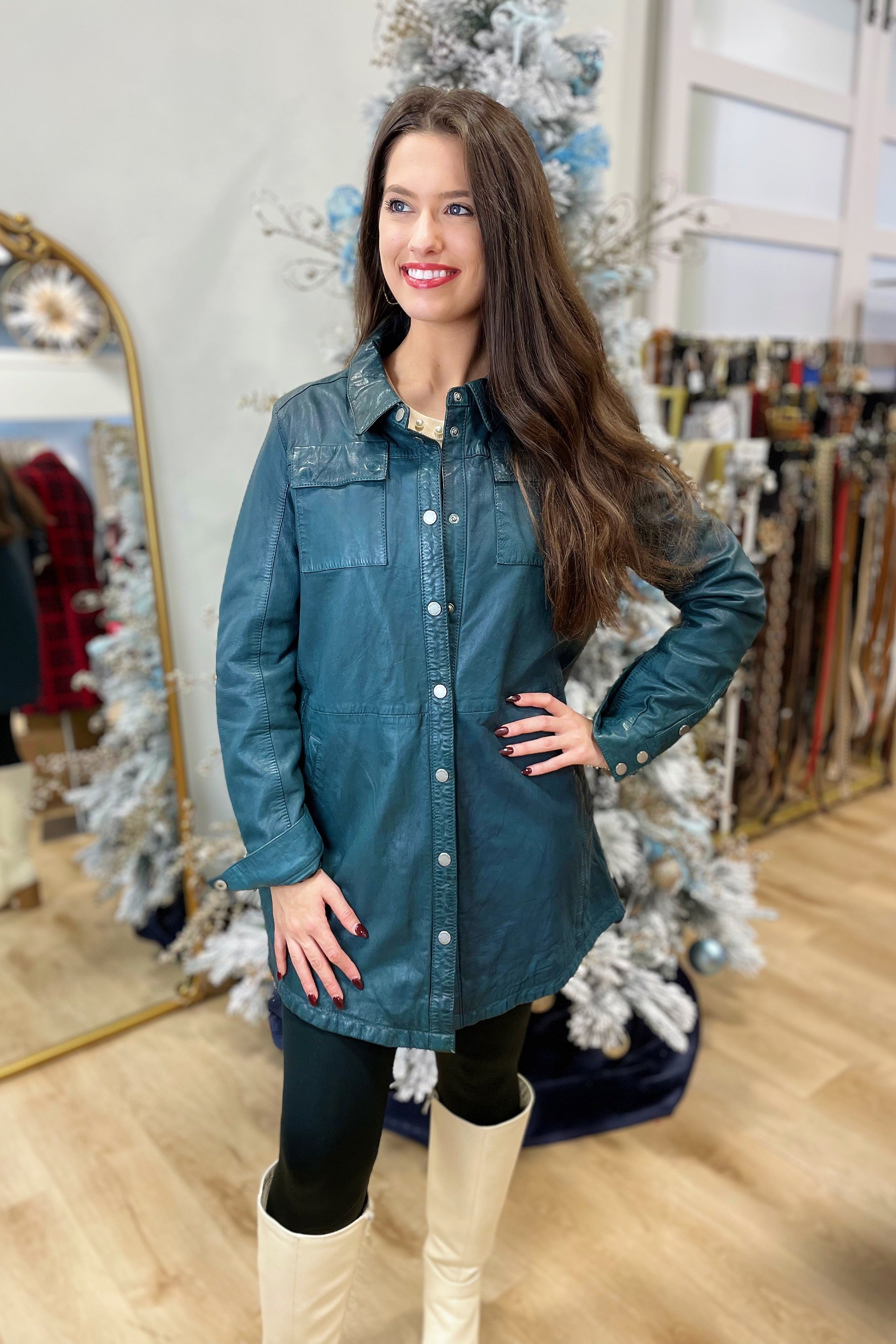 Crafted from soft lambskin leather with a stunning chrome finish, The Mahi jacket is an essential for the fall season. With a shacket style, it will keep you warm and looking stylish all season long.