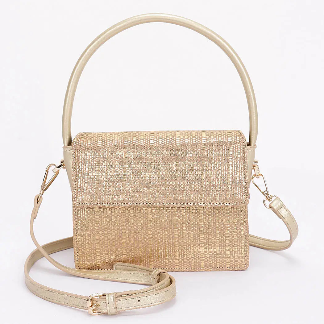 Metallic Faux Straw Top Handle Bag * 7W*6H*3D * Polyurethane,Mixed Metal * Introducing the "Golden Weave Elegance" – a stunning metallic faux straw top handle bag that combines luxury and practicality. Crafted from exquisite woven fabric, this bag is not just an accessory; it's a statement piece that elevates any outfit. Embrace sophistication and style with every carry.