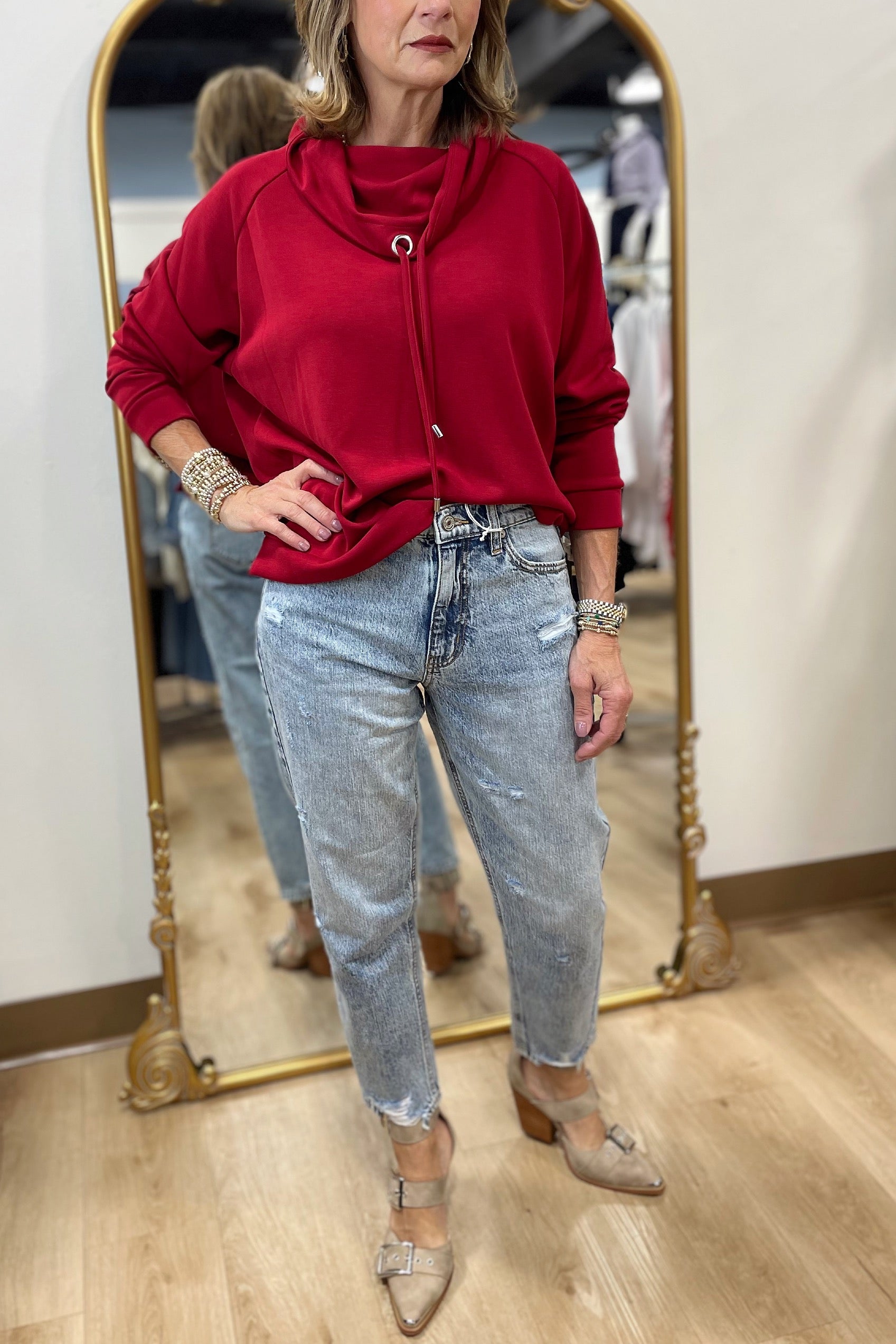 Multiples Cuffed Long Sleeve Raglan Drawstring Cowl Collar Top Crimson.