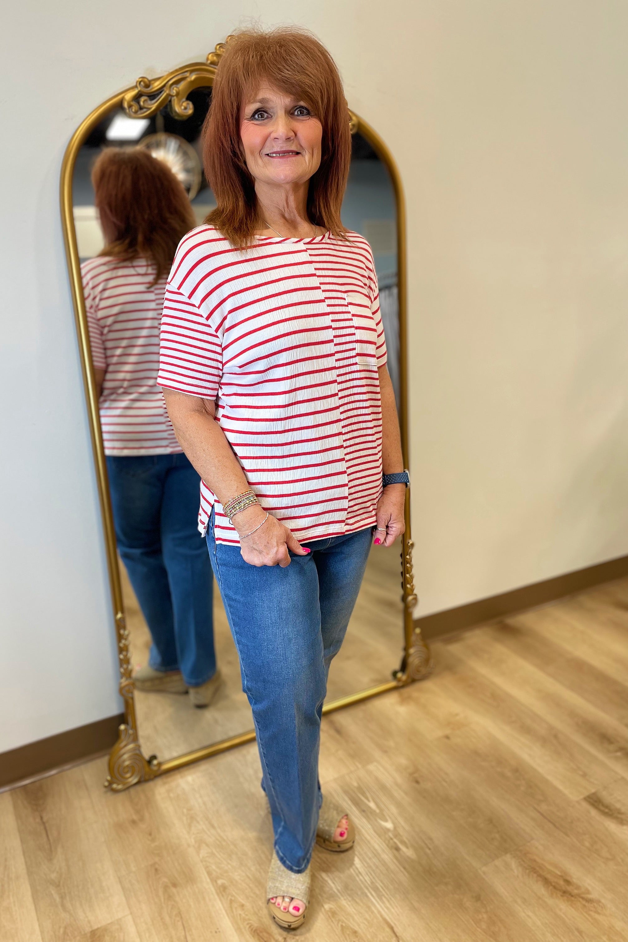 Multiples Short Sleeve Drop Shoulder Scoop Neck 1 Pocket Boxy Top Fiery Red