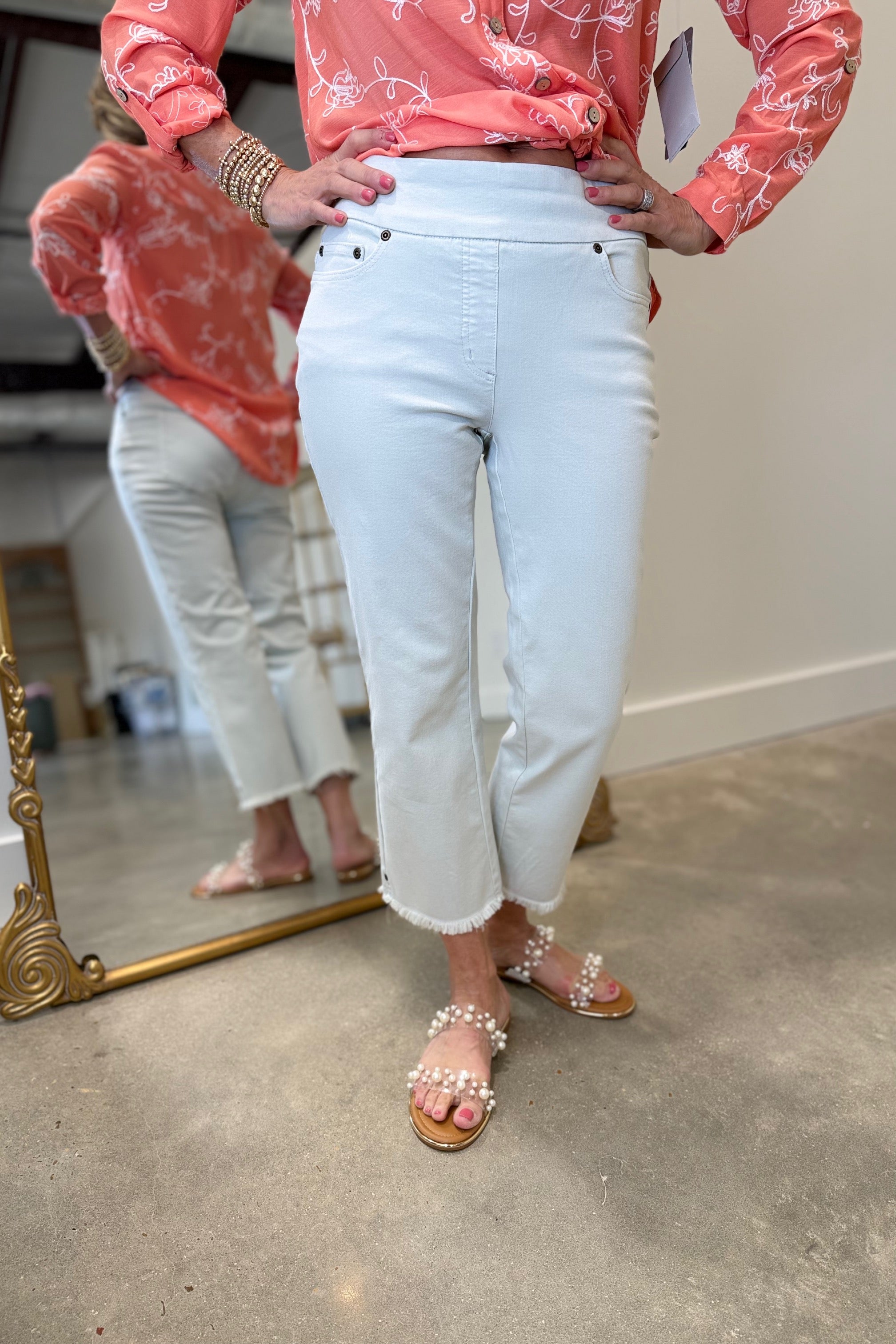 Multiples Pull On 5 Pocket Fringe Hem Crop Pant Icy Grey.
