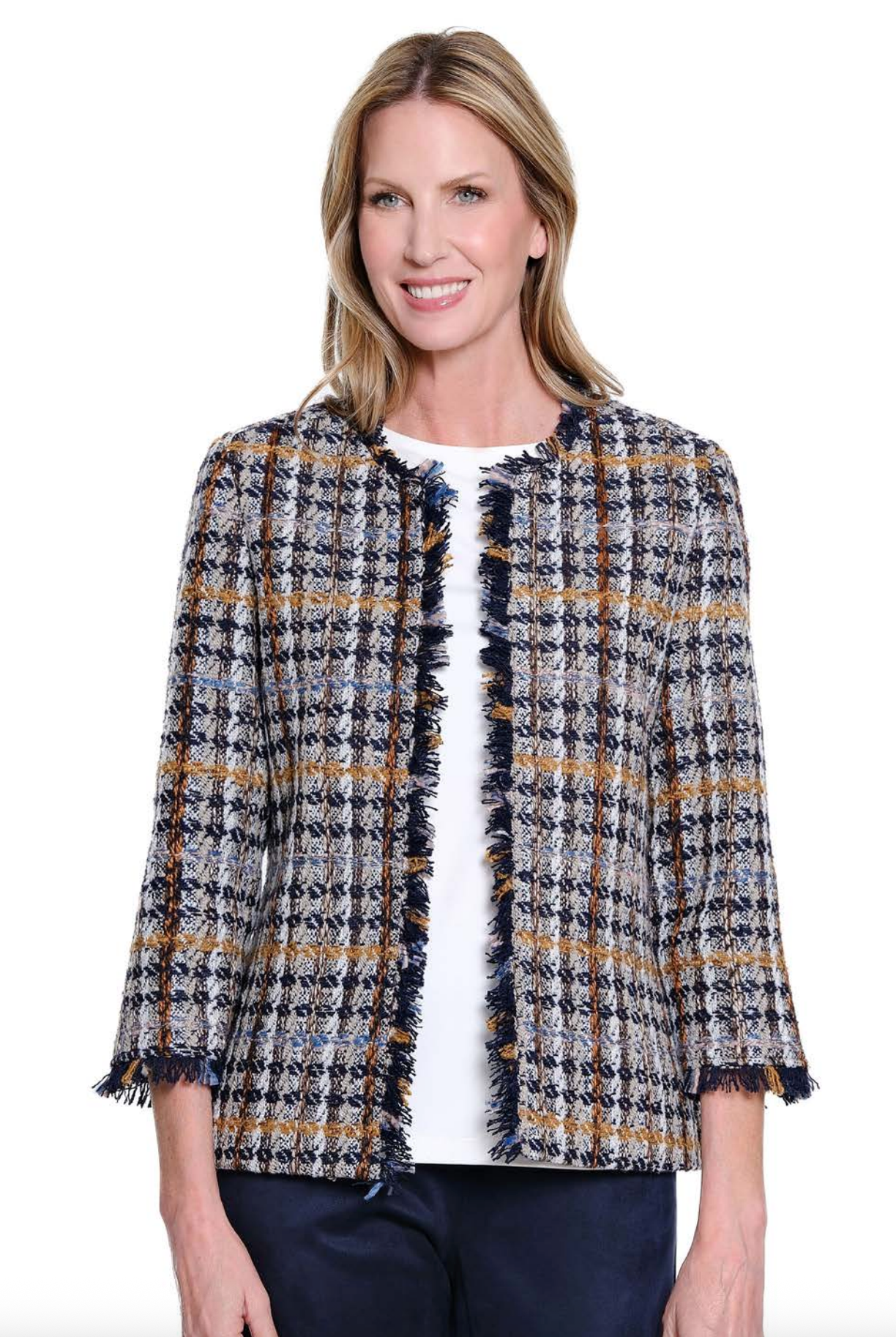 Multiples 3/4 Sleeve Open Front Fringe Accented Jacket Blue Multi