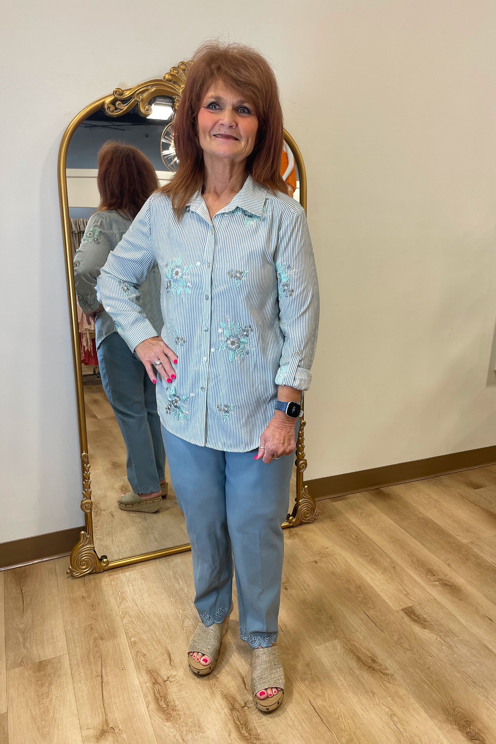 Multiples Pull On Ankle Pant w Real Front & Faux Back Packets & Scallop Embroidery Hem Chambray