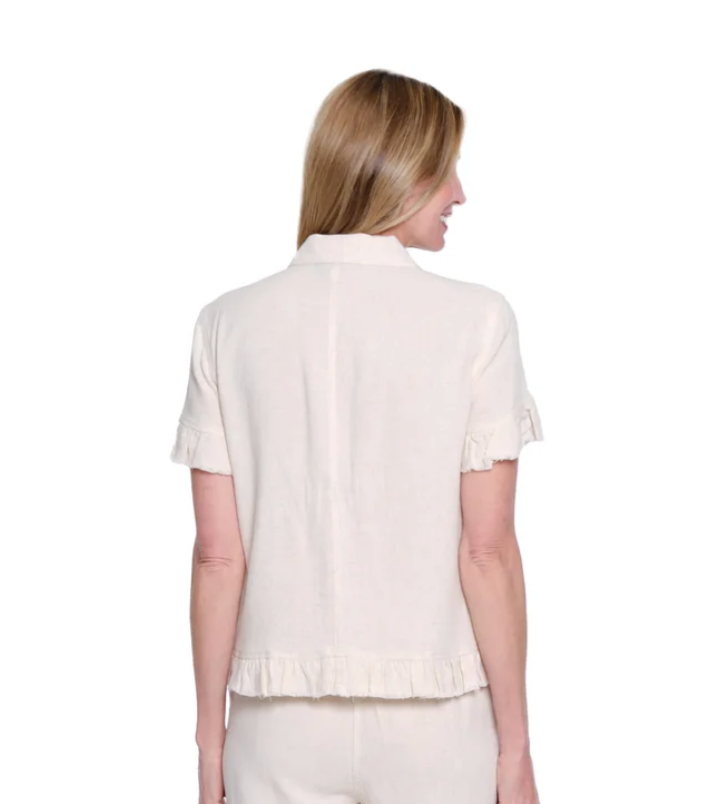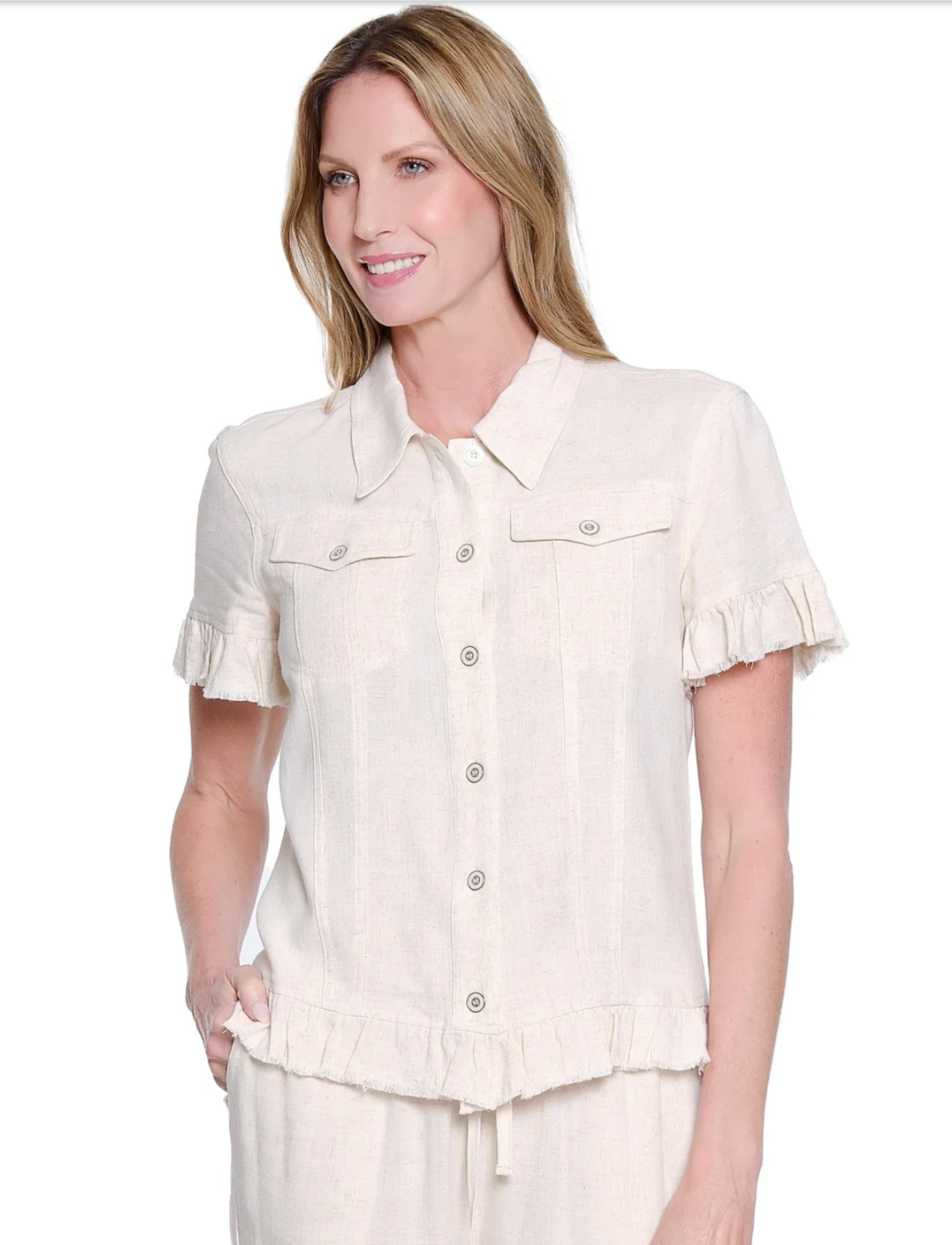 Multiples Ruffle Short Sleeve 2 Pocket Ruffle Hem Jean Jacket Flax