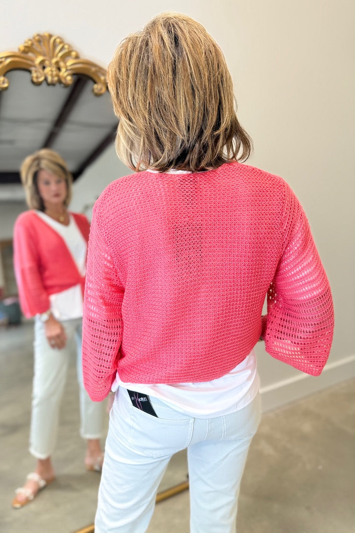 Multiples 3/4 Sleeve Tie Front Waist Sweater Cardigan Coral Pink