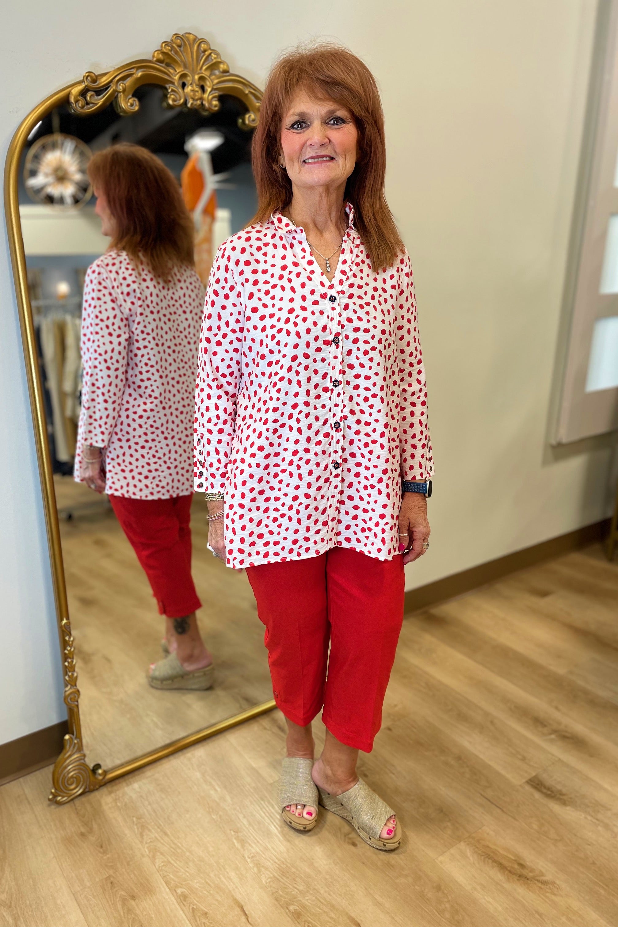 Multiples 5 Button Placket 3/4 Sleeve Wire Collar Y Neck Button Front Shirt Fiery Red