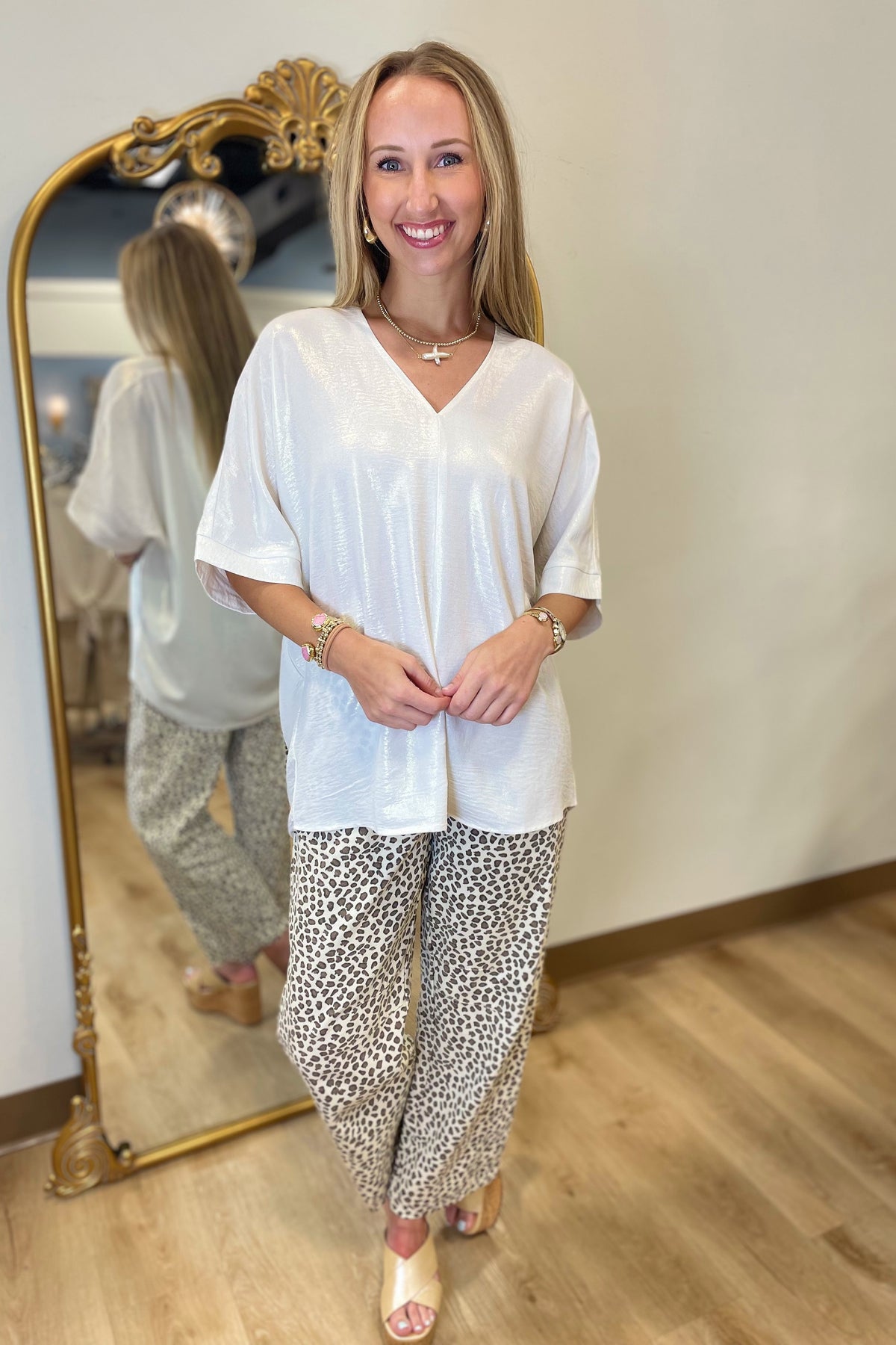 Night Out Shimmer Oversized Top w V Neck Pearl