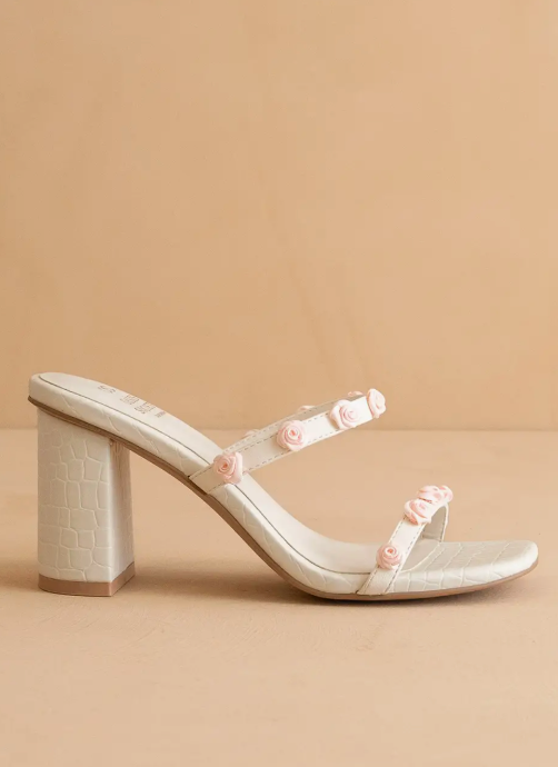 A gorgeous, girly, minimalist heel with sweet rosettes on a square toe sandal. Materials: * Upper Material: Vegan Leather Upper * Insole Material: DreamCloud Cushion * Sole or Heel Material: Synthetic Wrap Heel.